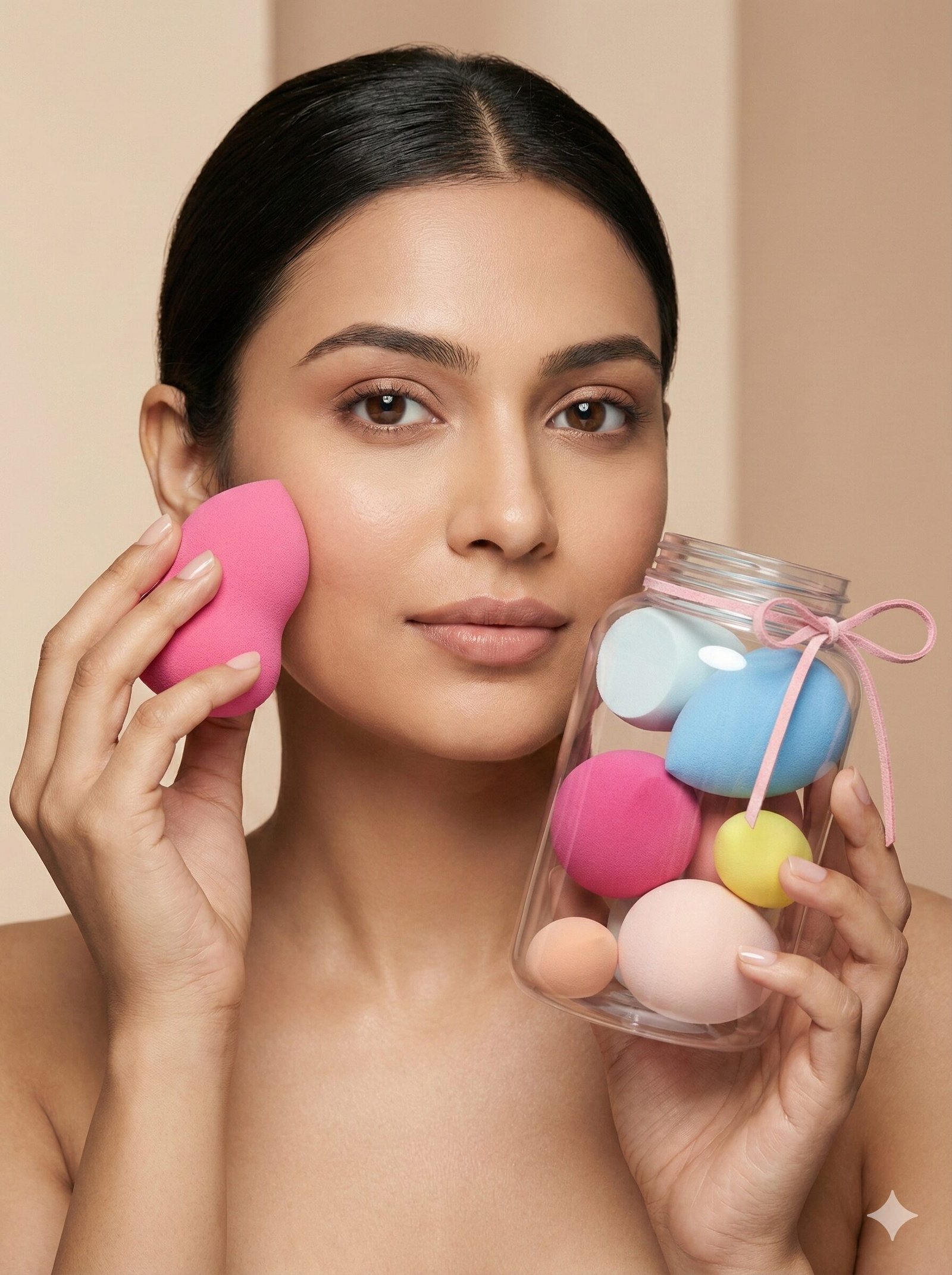 Product Overview: Master your makeup routine with the Flawless Base Blending Collection, a versatile set of 6 premium beauty sponges designed to handle every step of your regimen. From priming to setting, this multi-colored assortment offers the perfect tool for every curve and contour of your face, all conveniently stored in a stylish glass-effect jar.