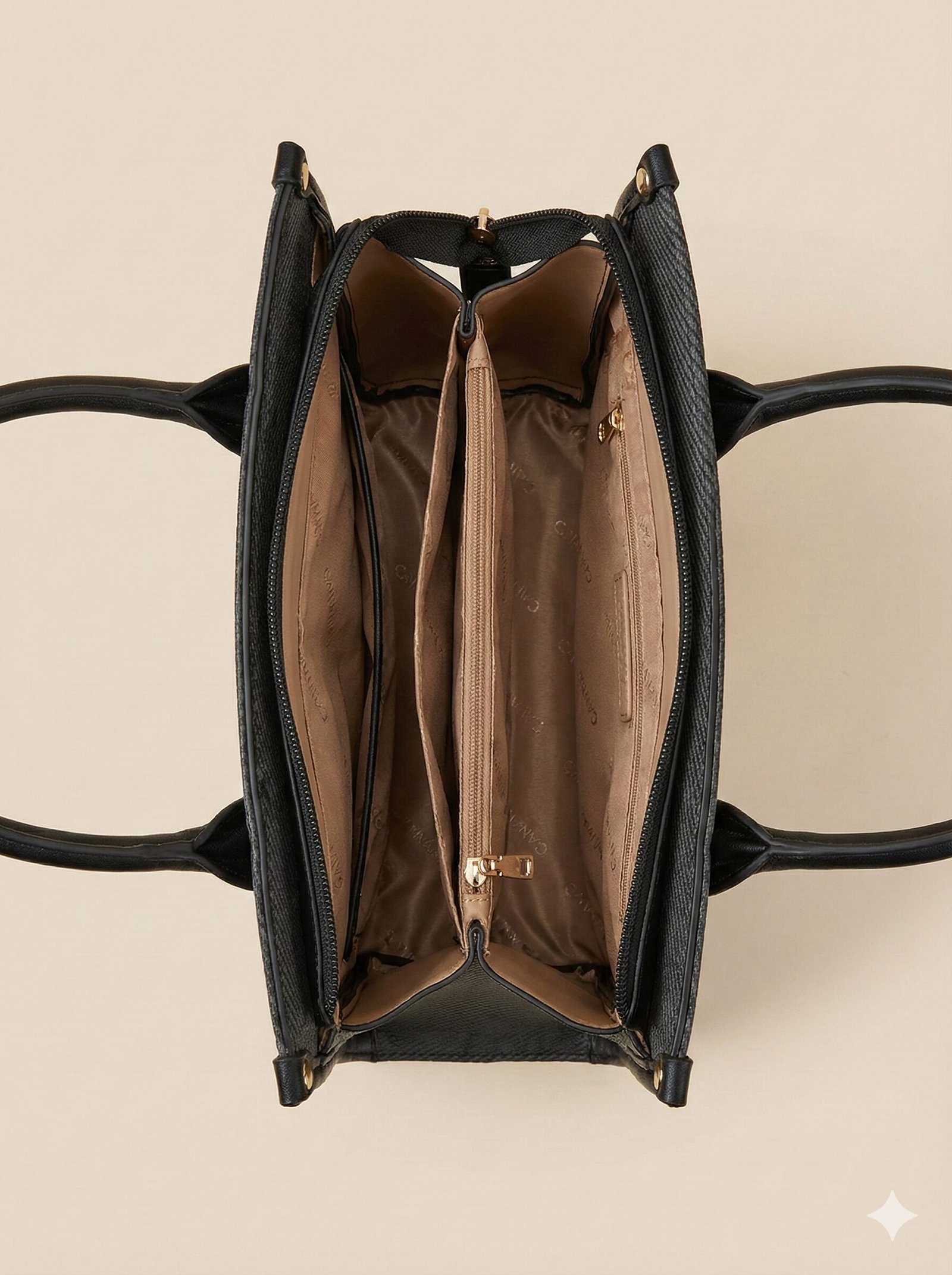 Organized Interior: The spacious interior is lined with beige branded fabric and features a central zipper divider pocket, creating three distinct compartments to keep your essentials secure and sorted.