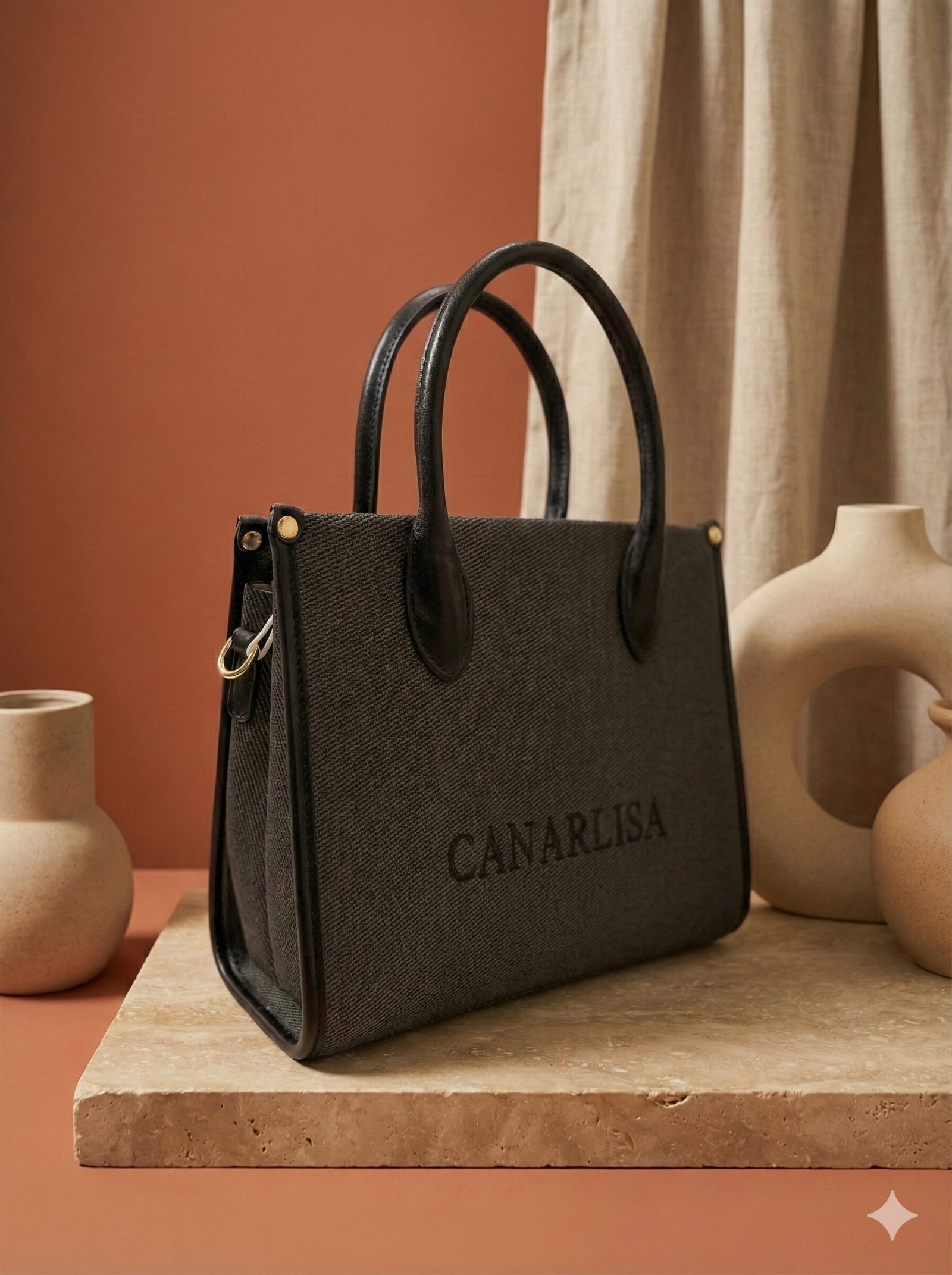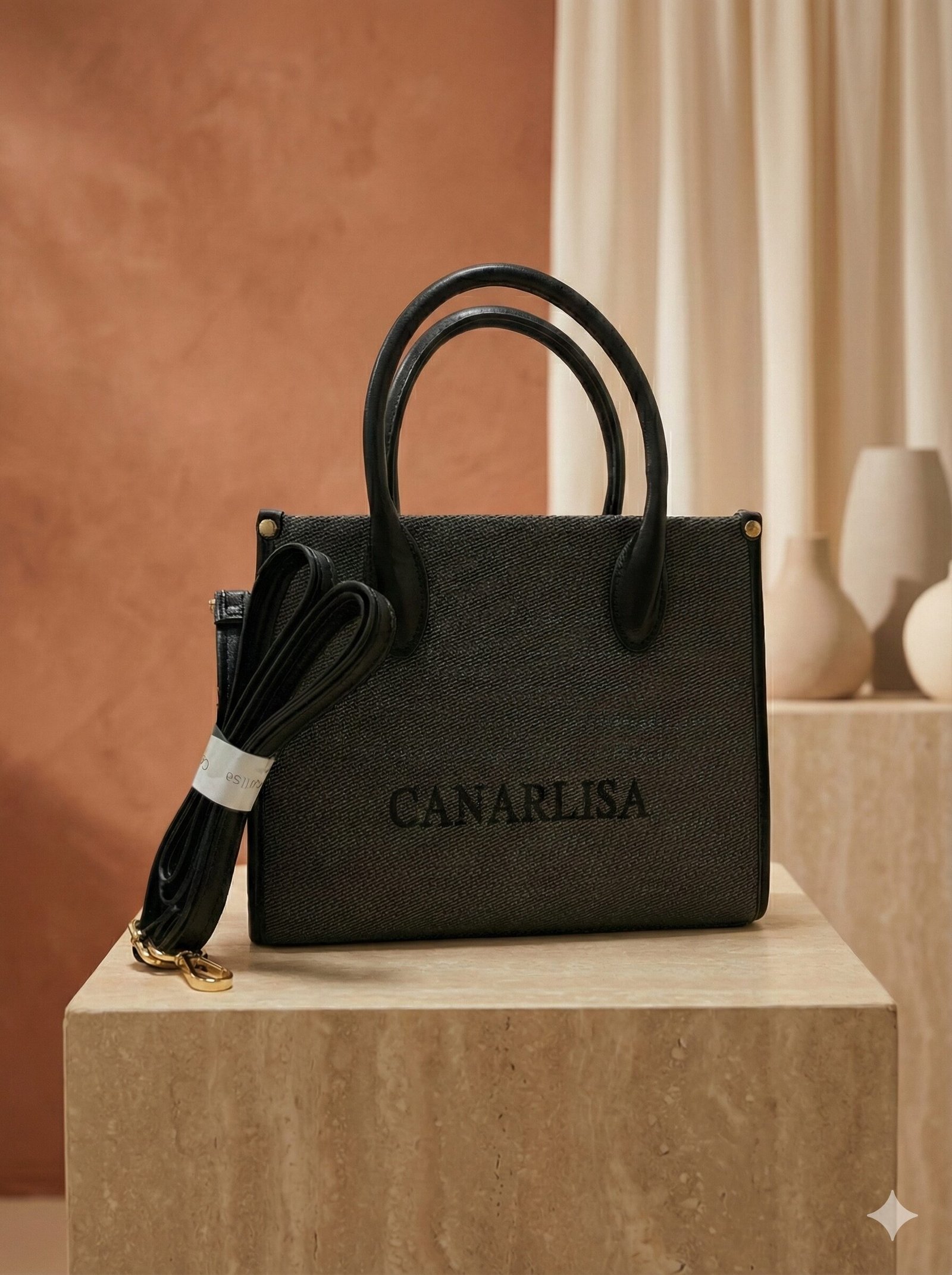 Product Overview: Make a statement with the Canarlisa Signature Canvas Tote Bag. Designed for the modern trendsetter, this bag features a sturdy, boxy silhouette wrapped in a high-quality, textured fabric. The bold “CANARLISA” branding on the front adds a touch of designer flair, while the gold-tone hardware provides a luxurious finish. Perfect for the office or a weekend outing, it keeps you organized without compromising on style.