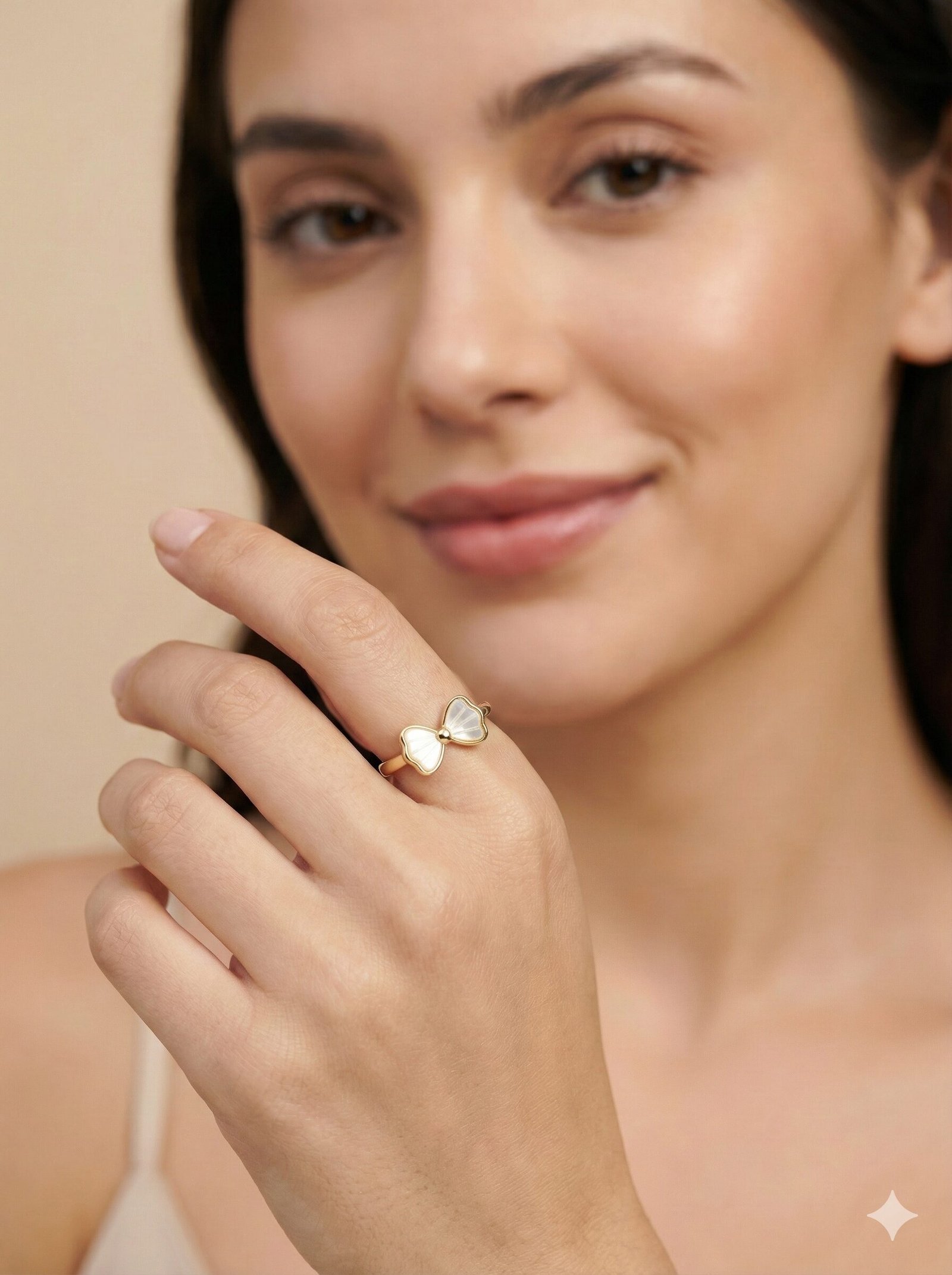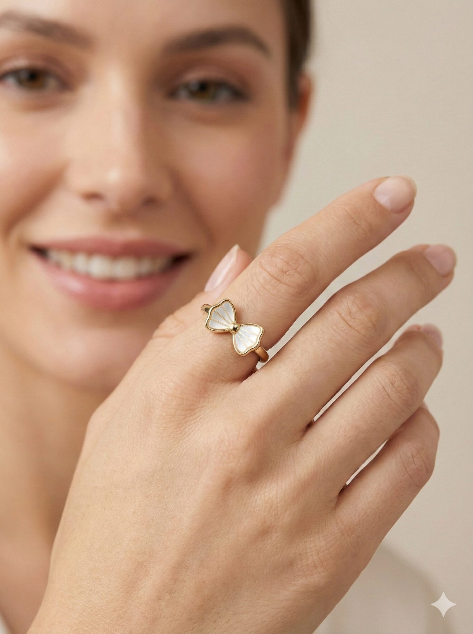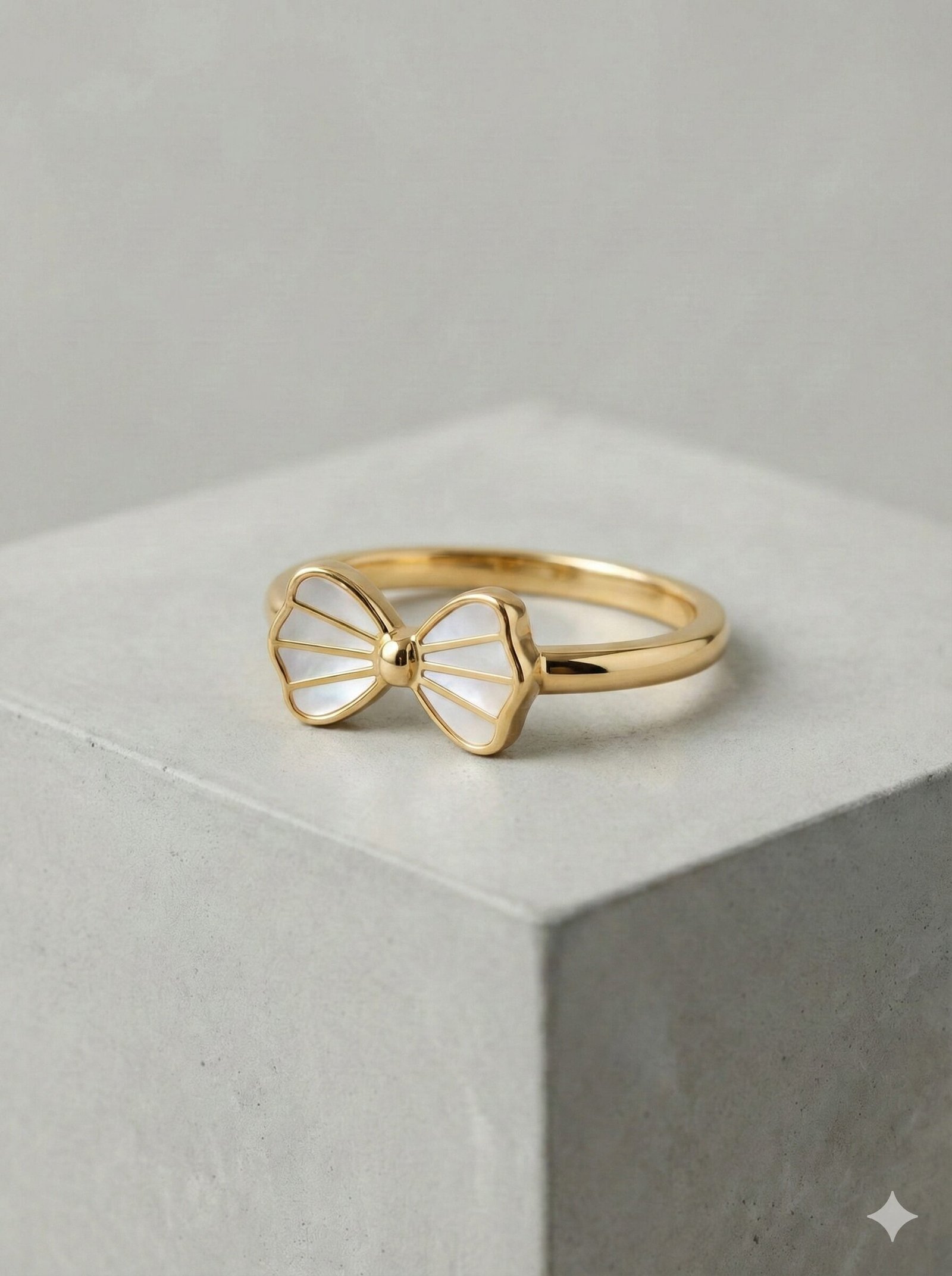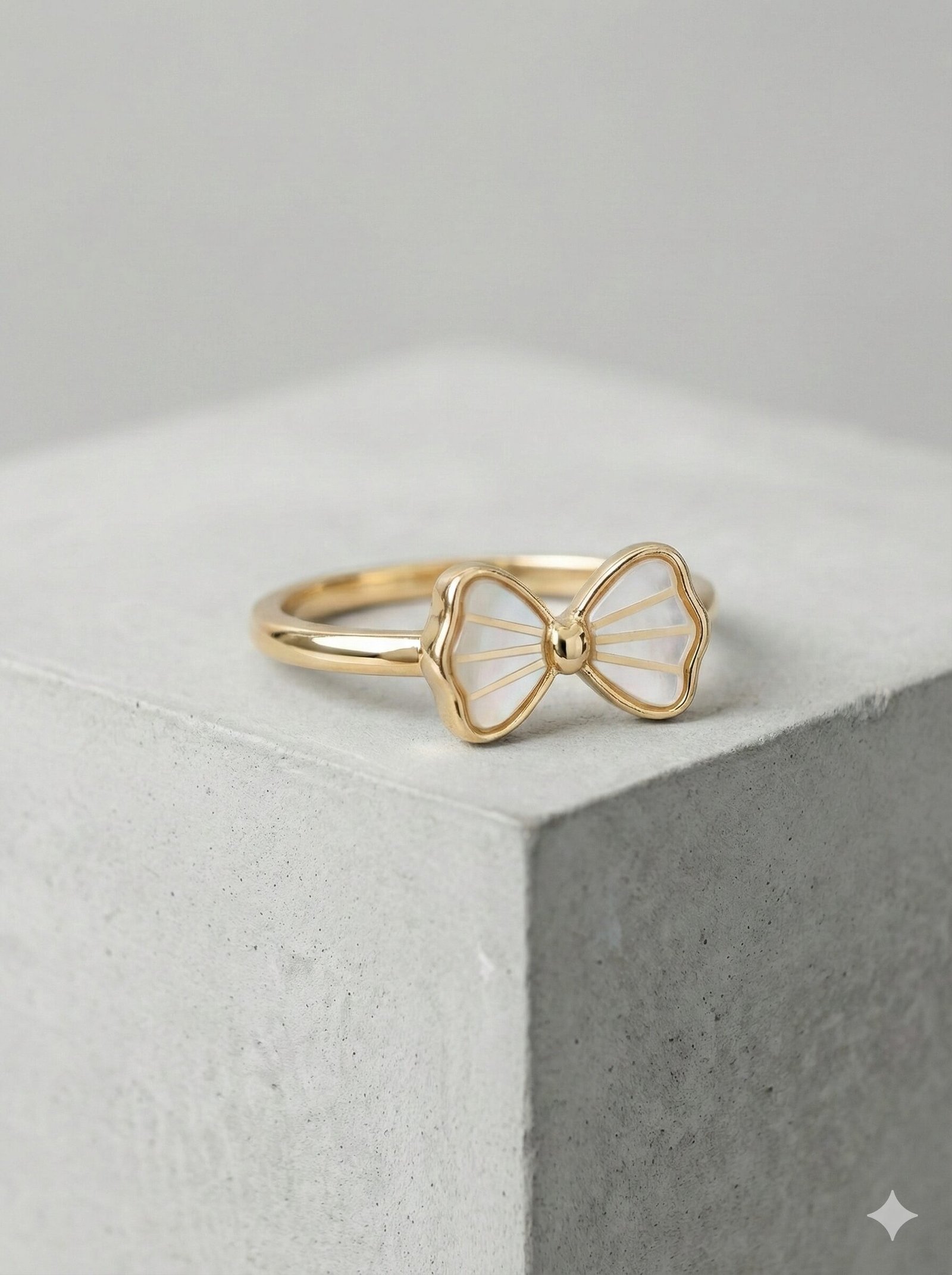 Style: The ring showcases a minimalist gold-tone band supporting a structured bow motif. The bow wings are filled with a white material possessing a pearlescent sheen, segmented by radiating gold-tone lines that add depth and texture.