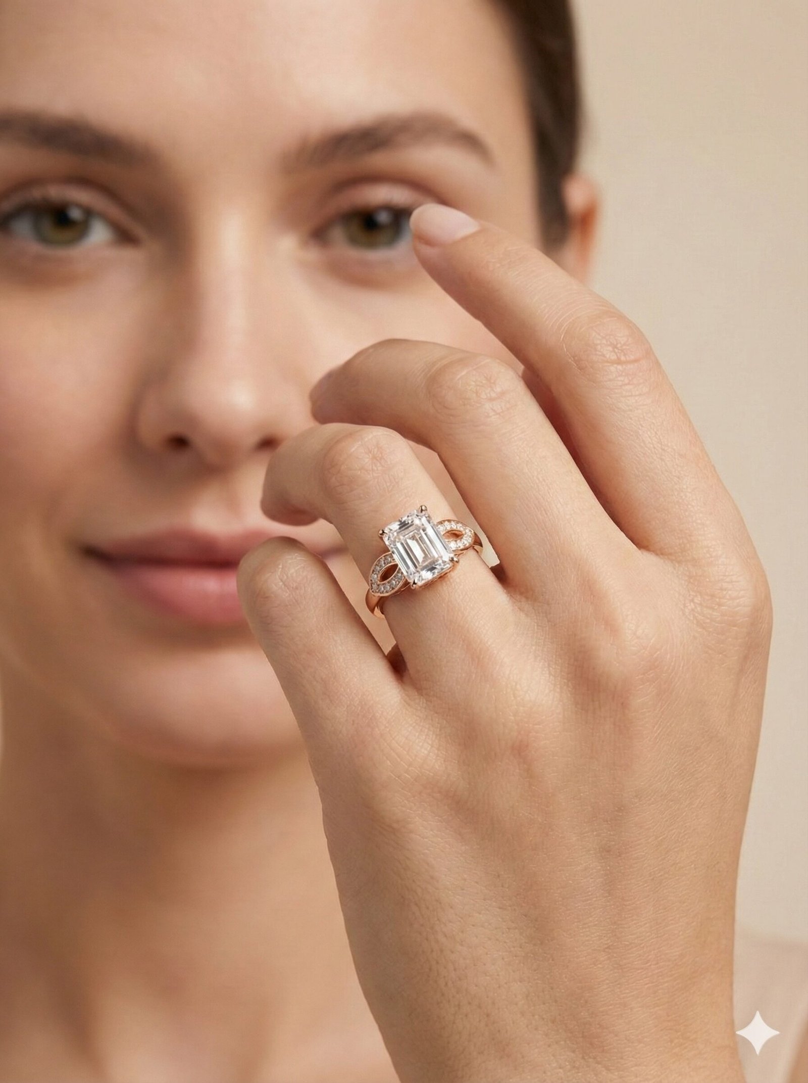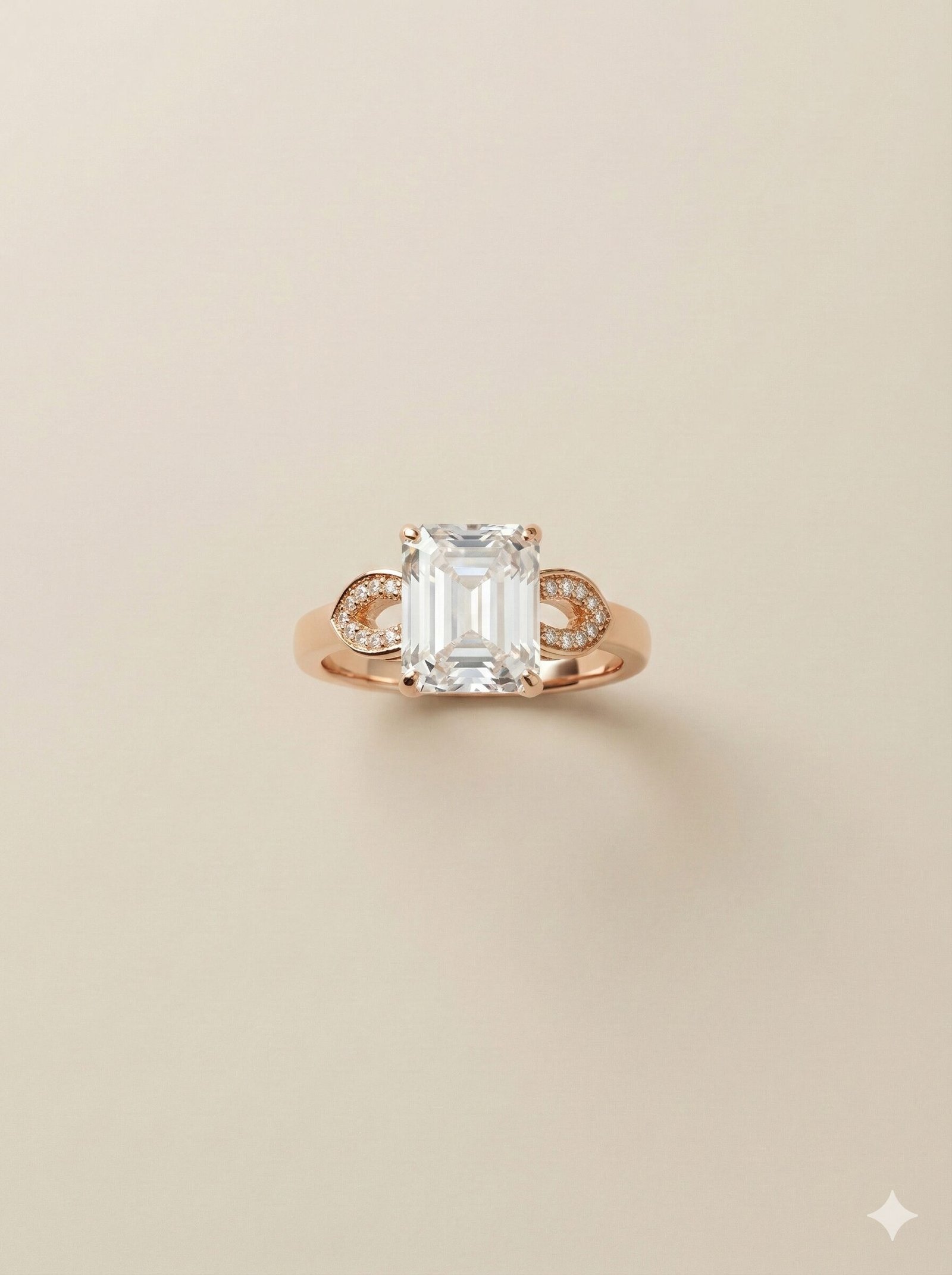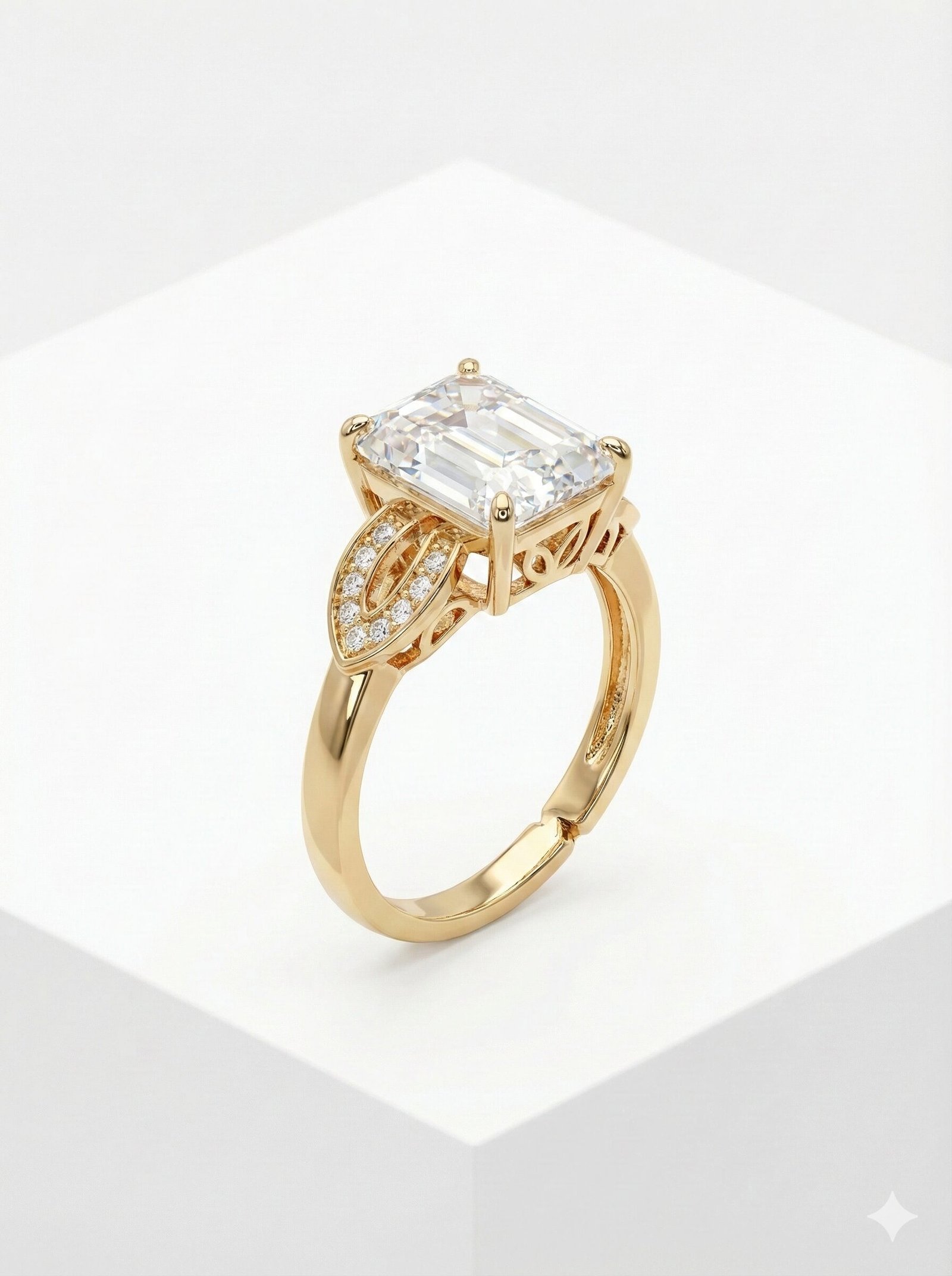 This statement ring combines geometric precision with organic detailing to create a refined accessory. The focal point is a large, clear emerald-cut stone held in a prong setting, complemented by a polished gold-tone finish.