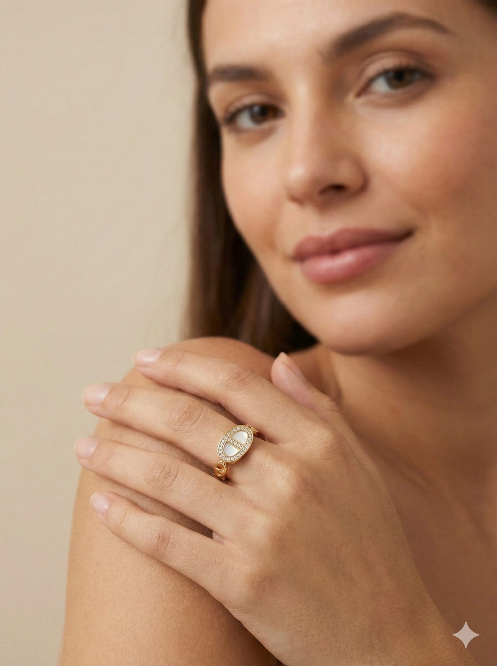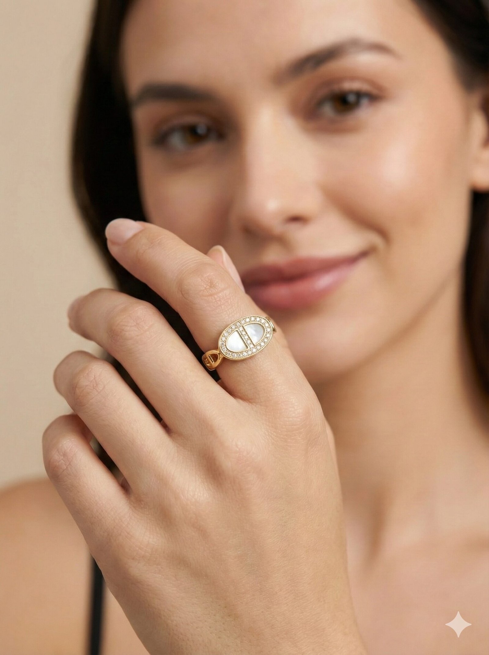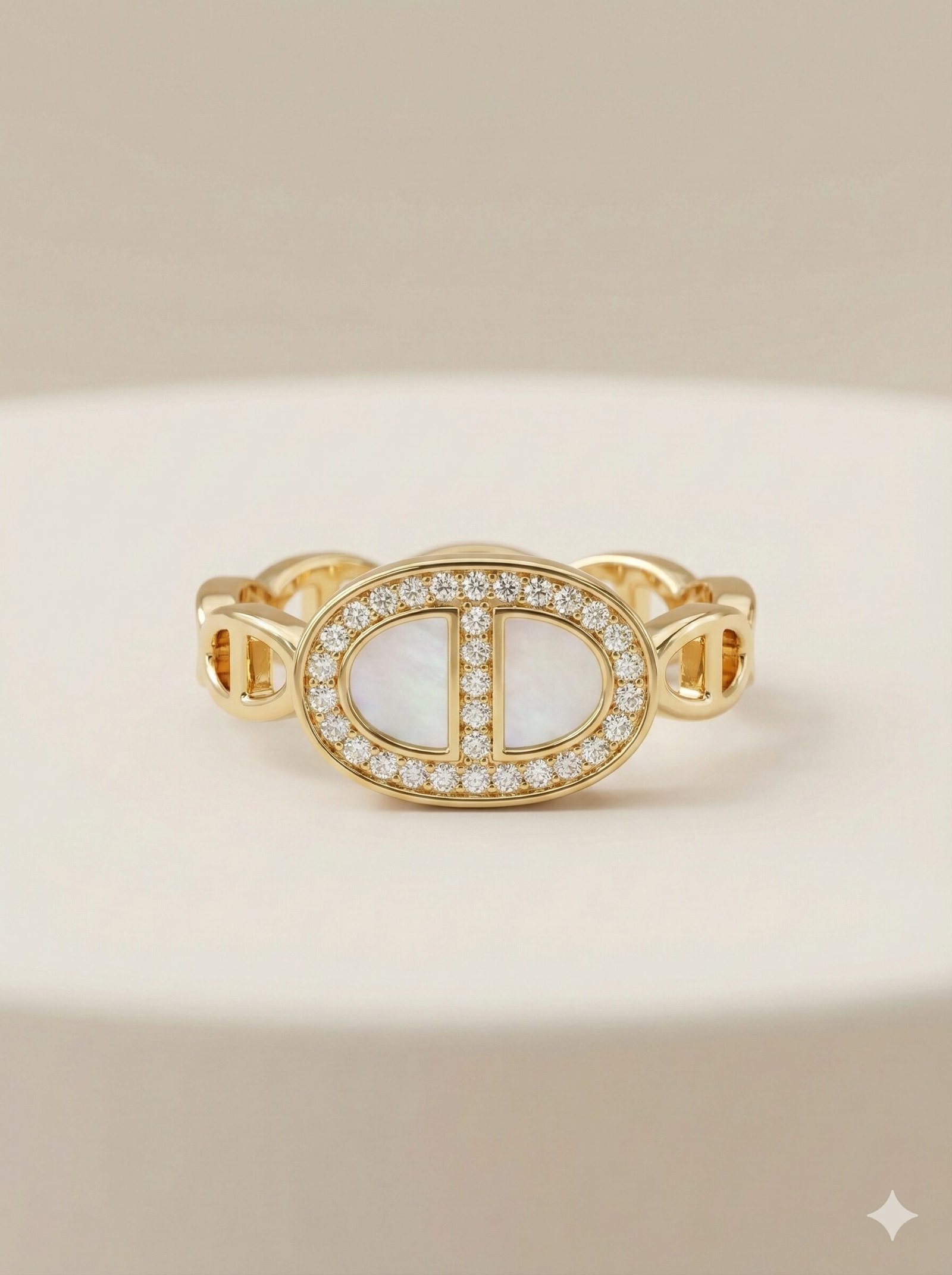 This elegant ring combines a classic chain-link motif with a luminous centerpiece for a balanced and timeless aesthetic.