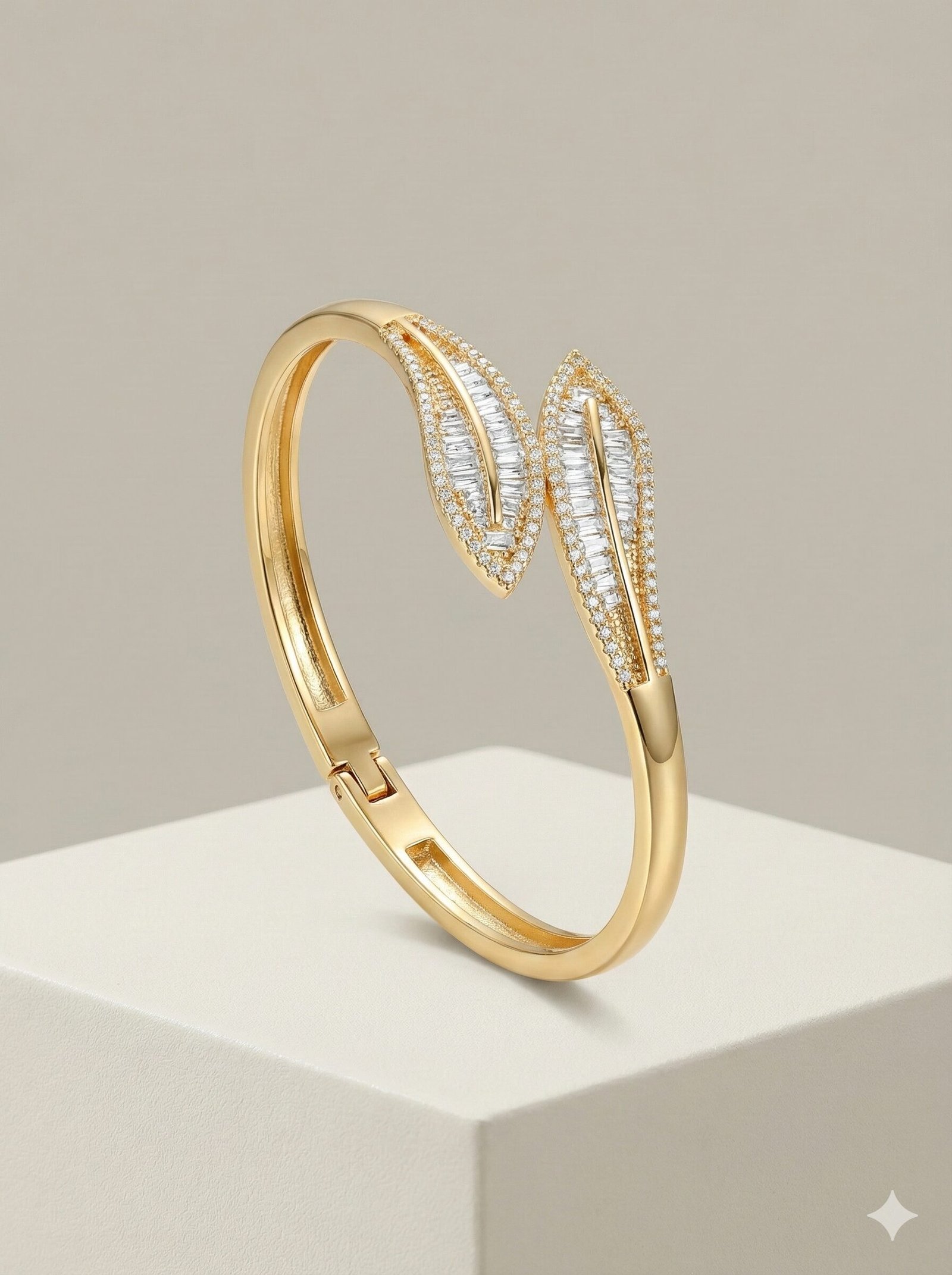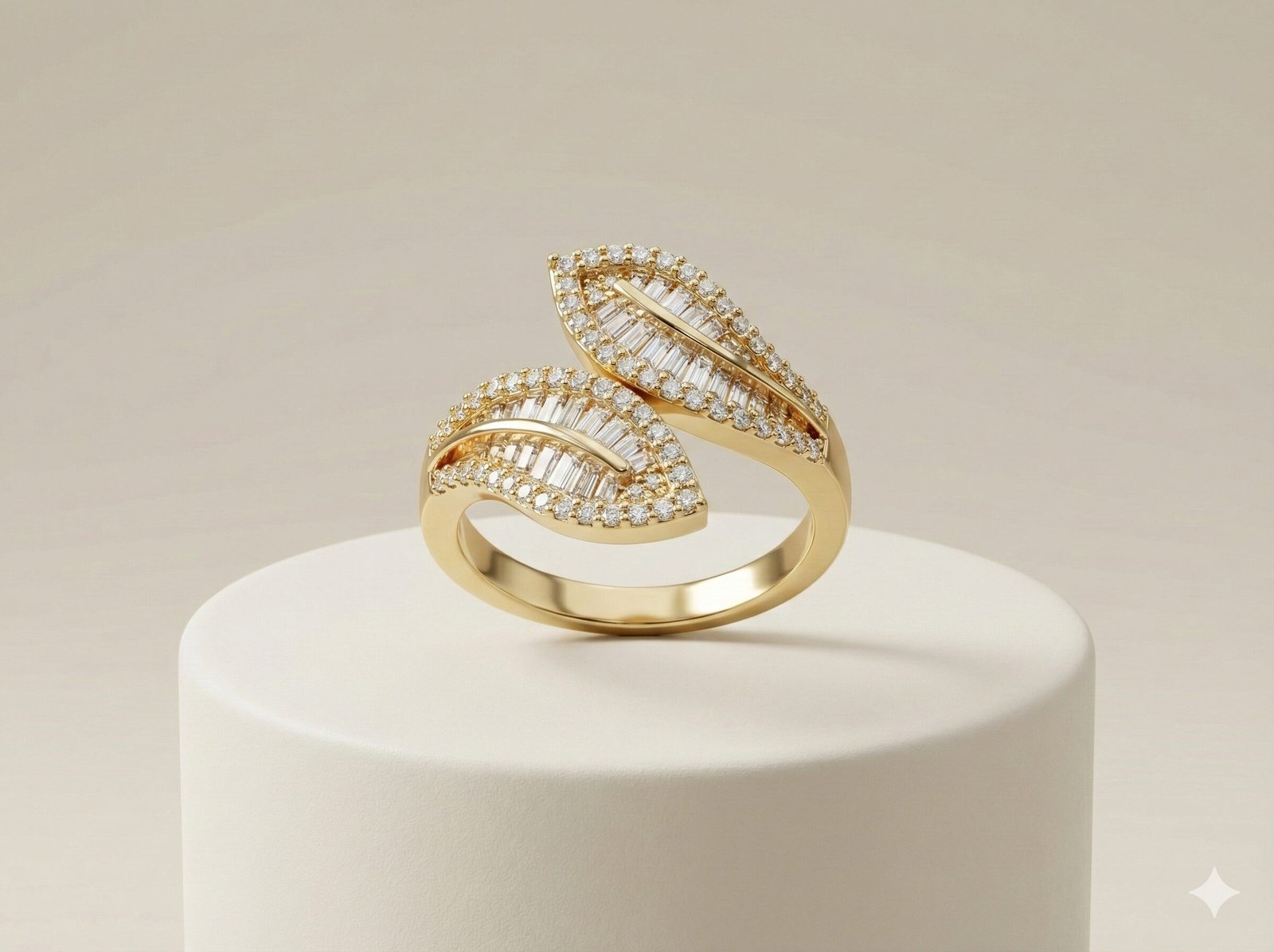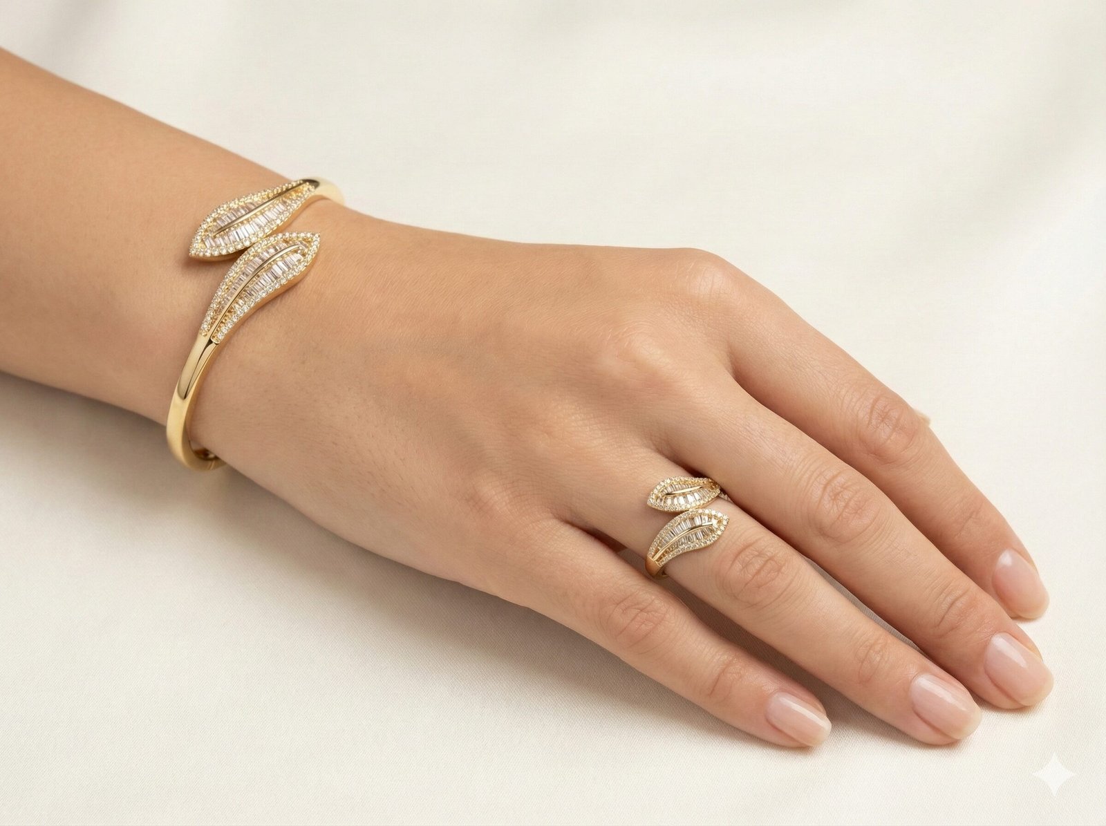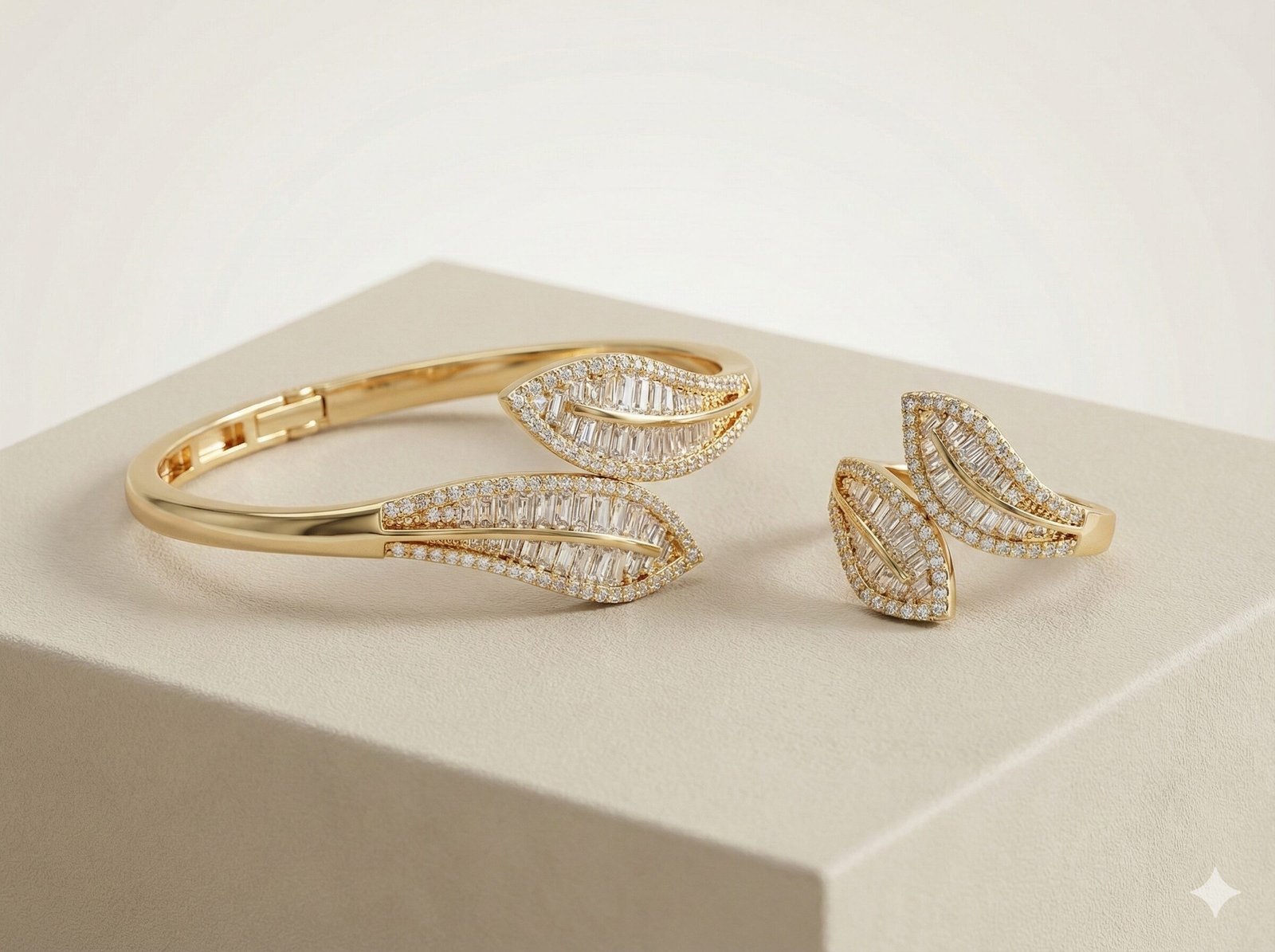 Style: Sophisticated and architectural, blending geometric baguette cuts with organic leaf shapes in a luxe gold-tone setting.