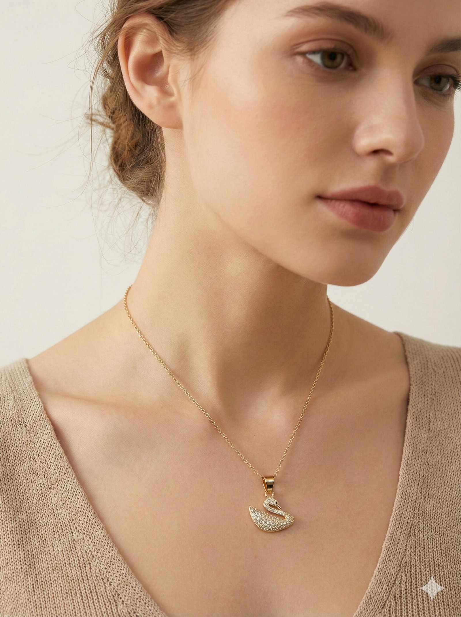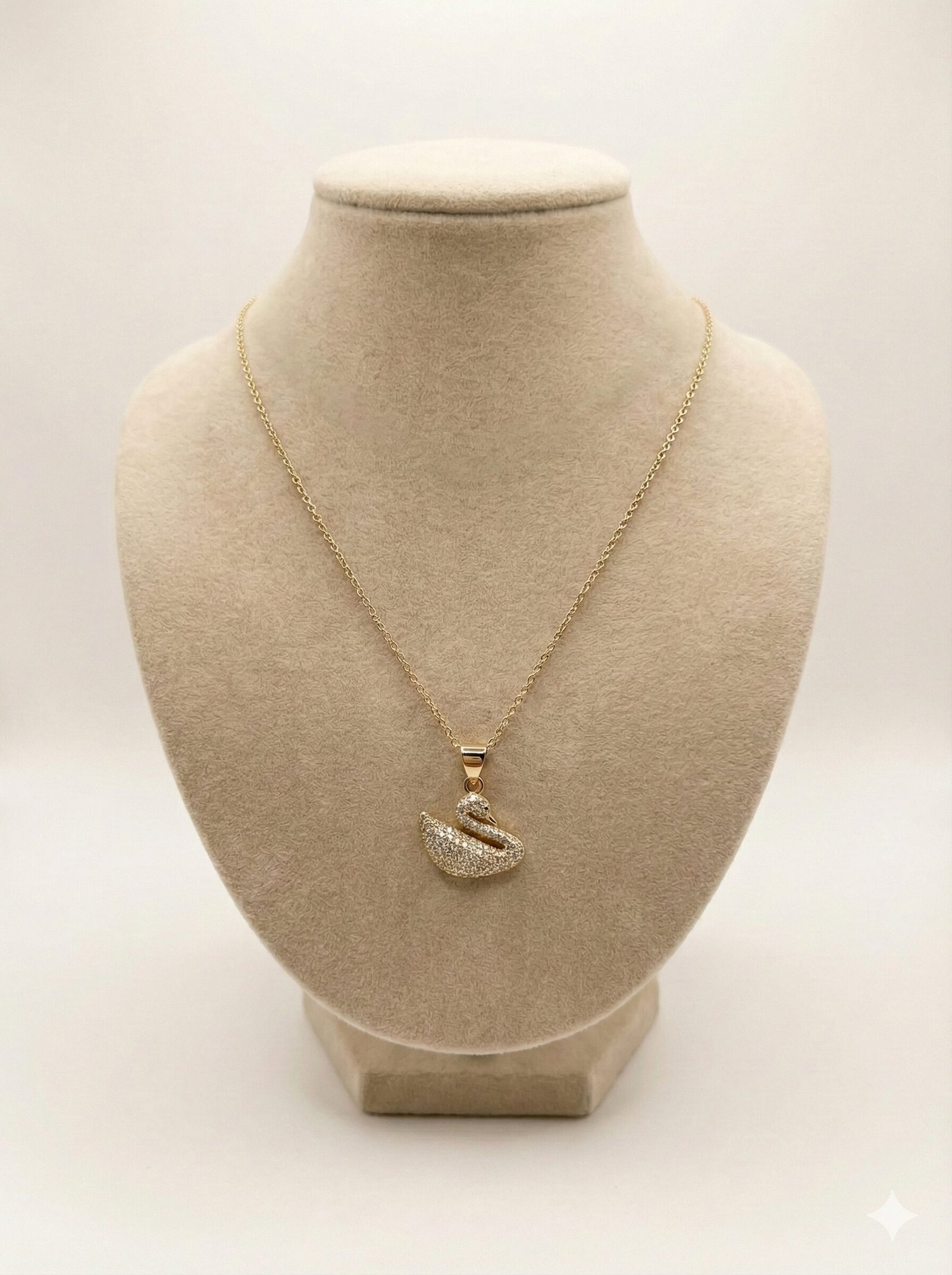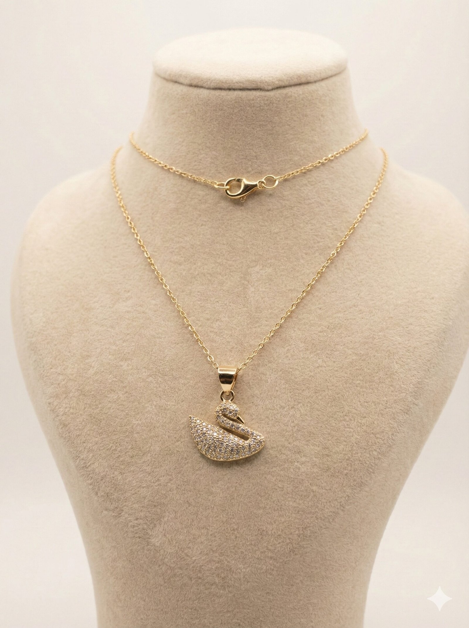 Style: The design showcases a sculpted swan silhouette paved with shimmering clear crystals, suspended from a delicate gold-tone cable chain.