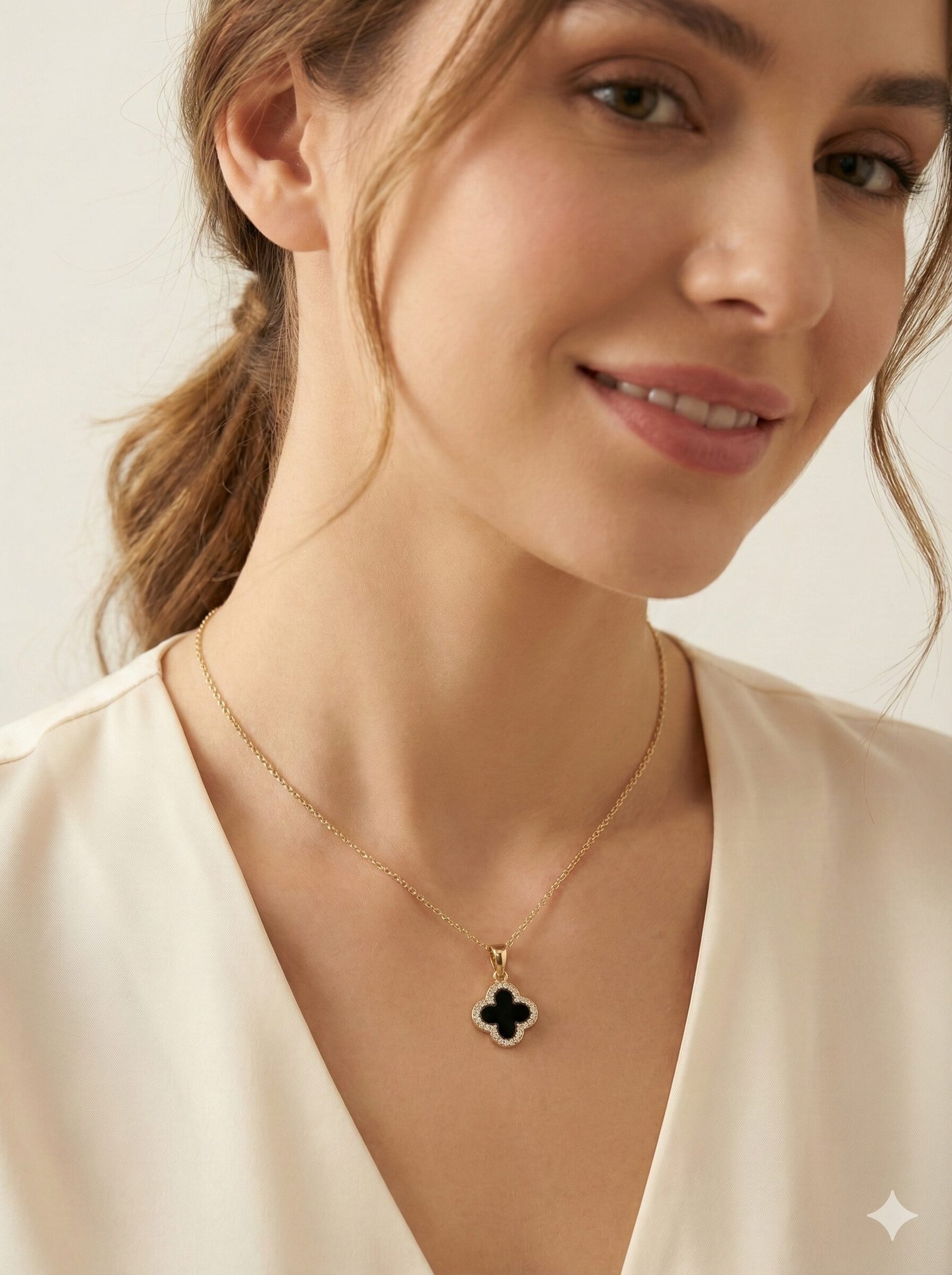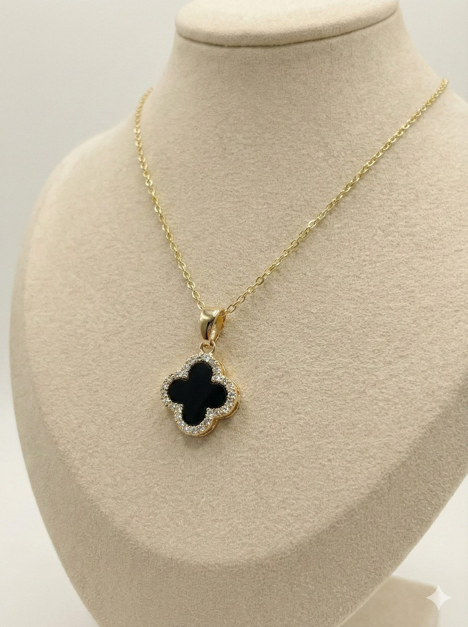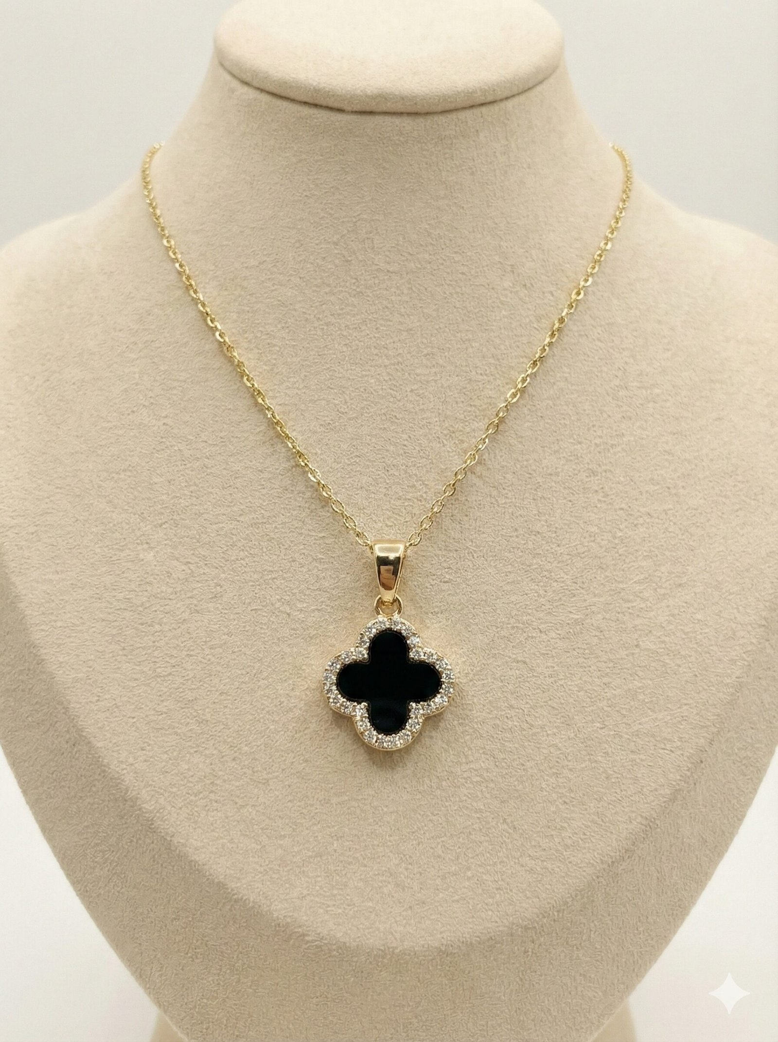 Style: The pendant features a distinct four-leaf clover shape with a smooth black center, surrounded by a halo of pave-set clear crystals on a delicate cable chain.