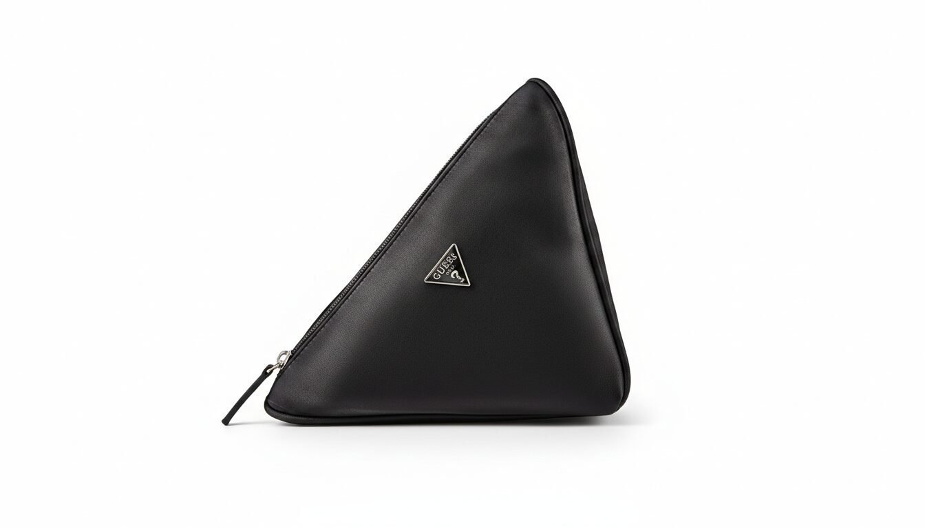 Signature Cosmetic Bag: A stylish, black faux-leather pouch in a unique triangular silhouette, finished with the classic GUESS logo—perfect for organizing your beauty essentials.