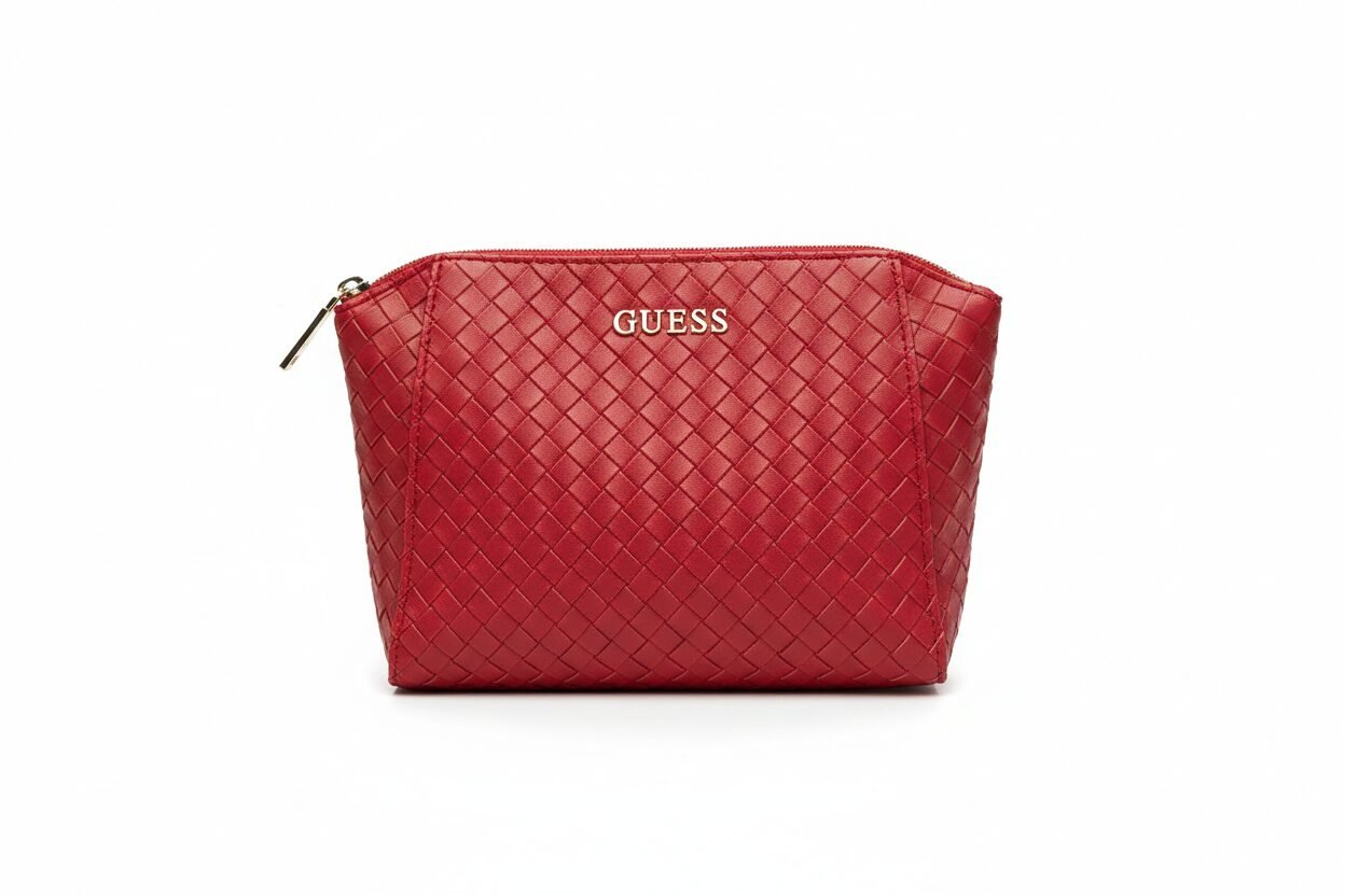 Woven Cosmetic Bag: A chic, red pouch featuring an intricate woven texture and the GUESS logo in gold lettering. This stylish accessory is perfect for organizing beauty essentials at home or on the go.