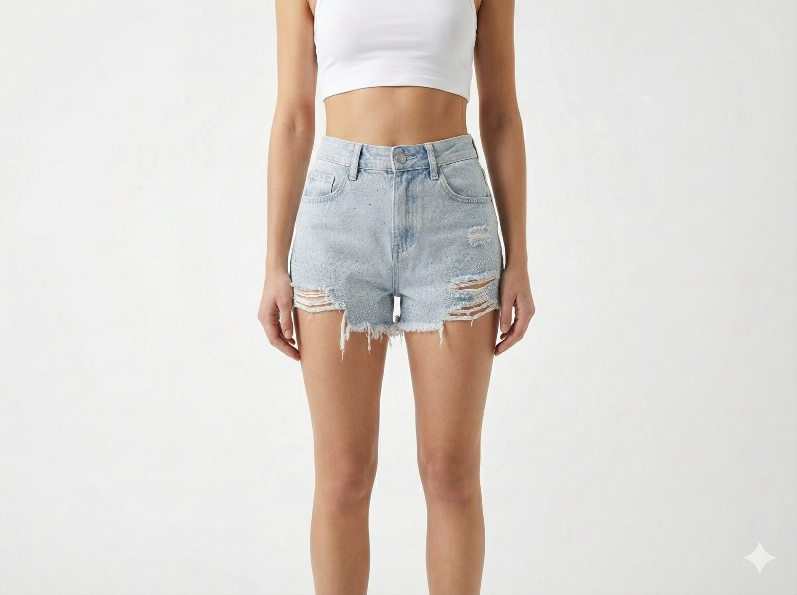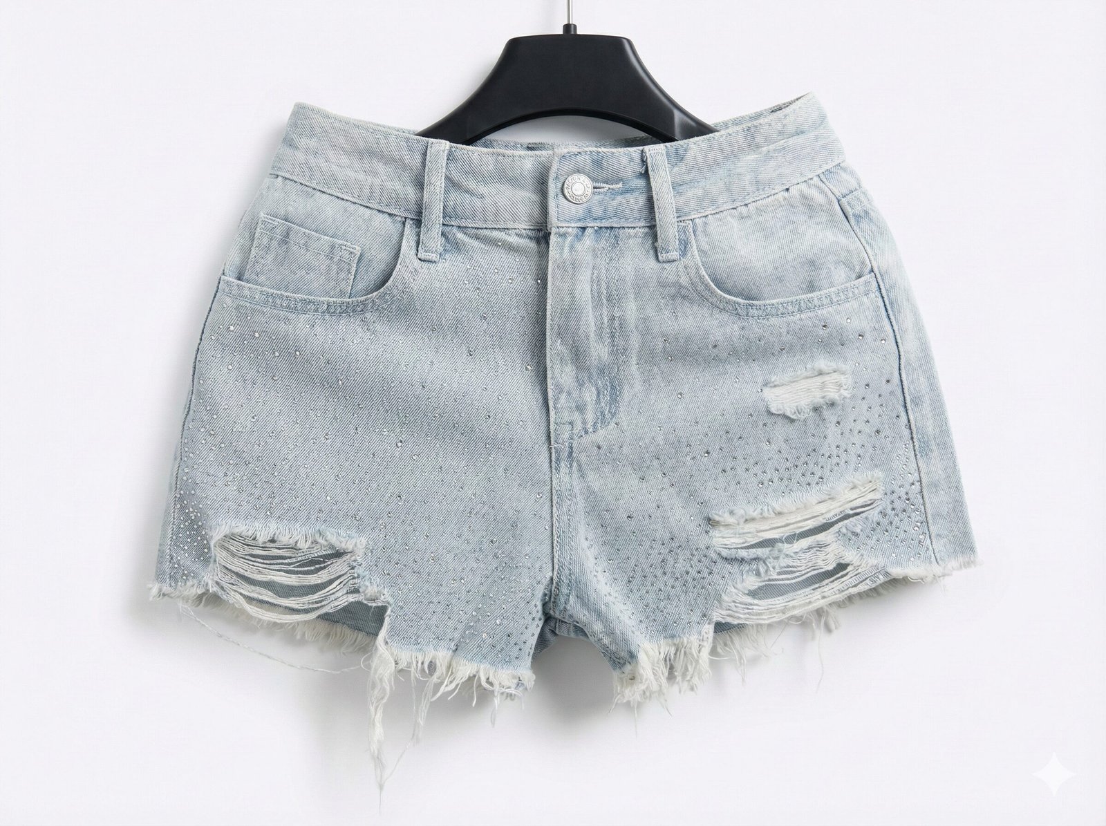 Product Overview: Turn heads this season with our High-Rise Rhinestone Embellished Denim Shorts. Designed for those who love to stand out, these shorts offer a unique twist on the classic summer staple. The sturdy light-wash denim provides a structured yet comfortable fit, while the sparkling details make them festival-ready.