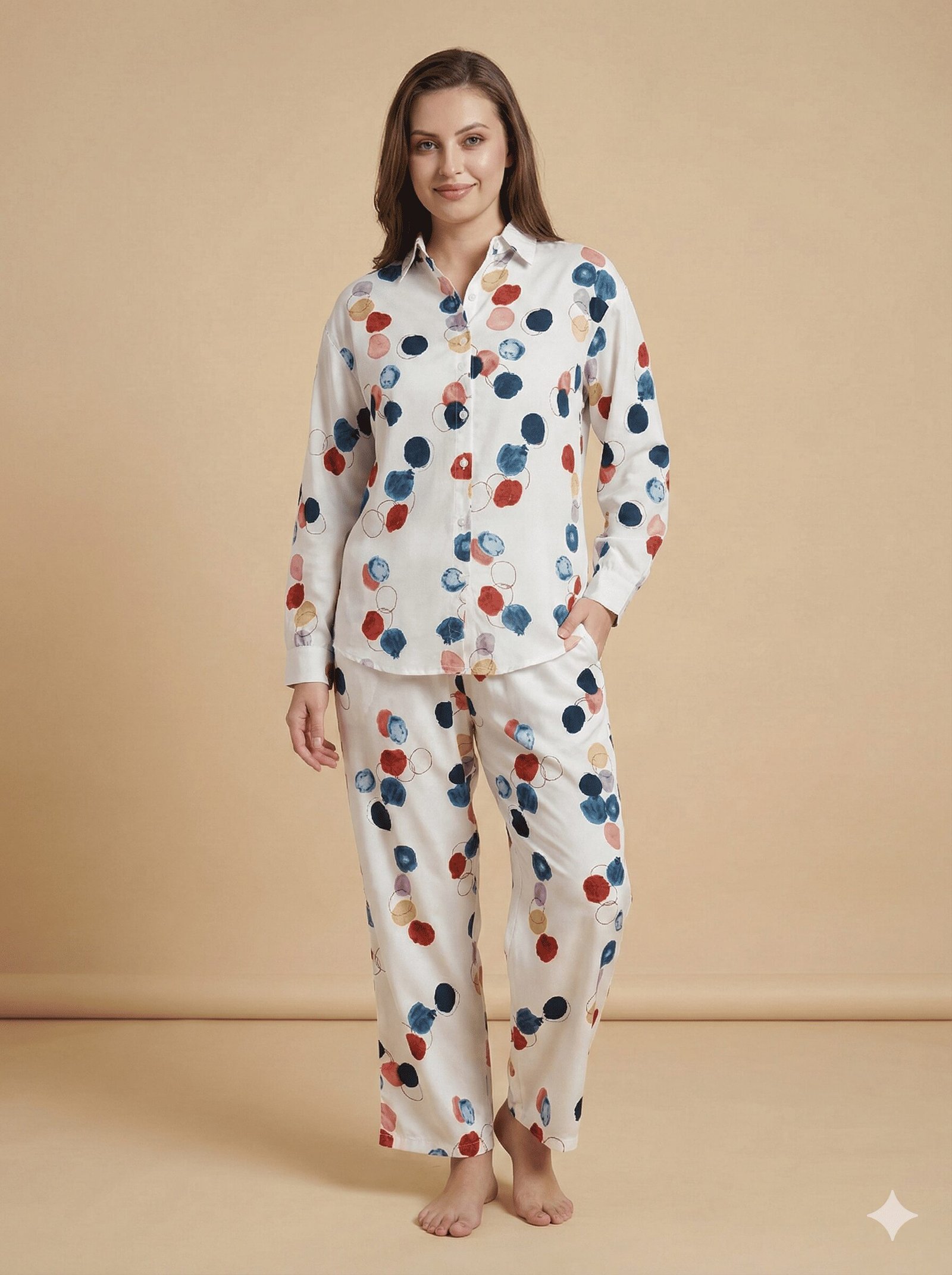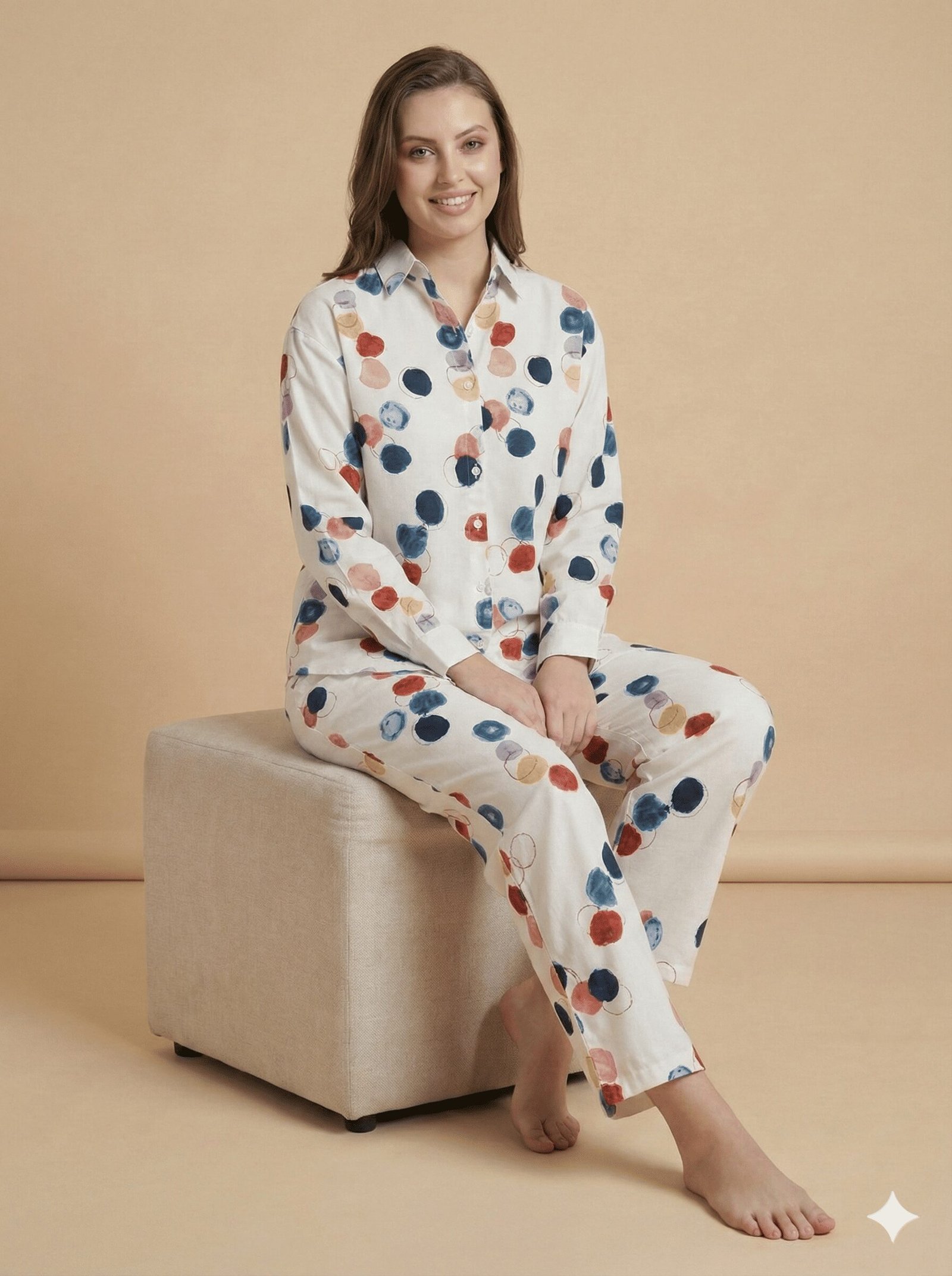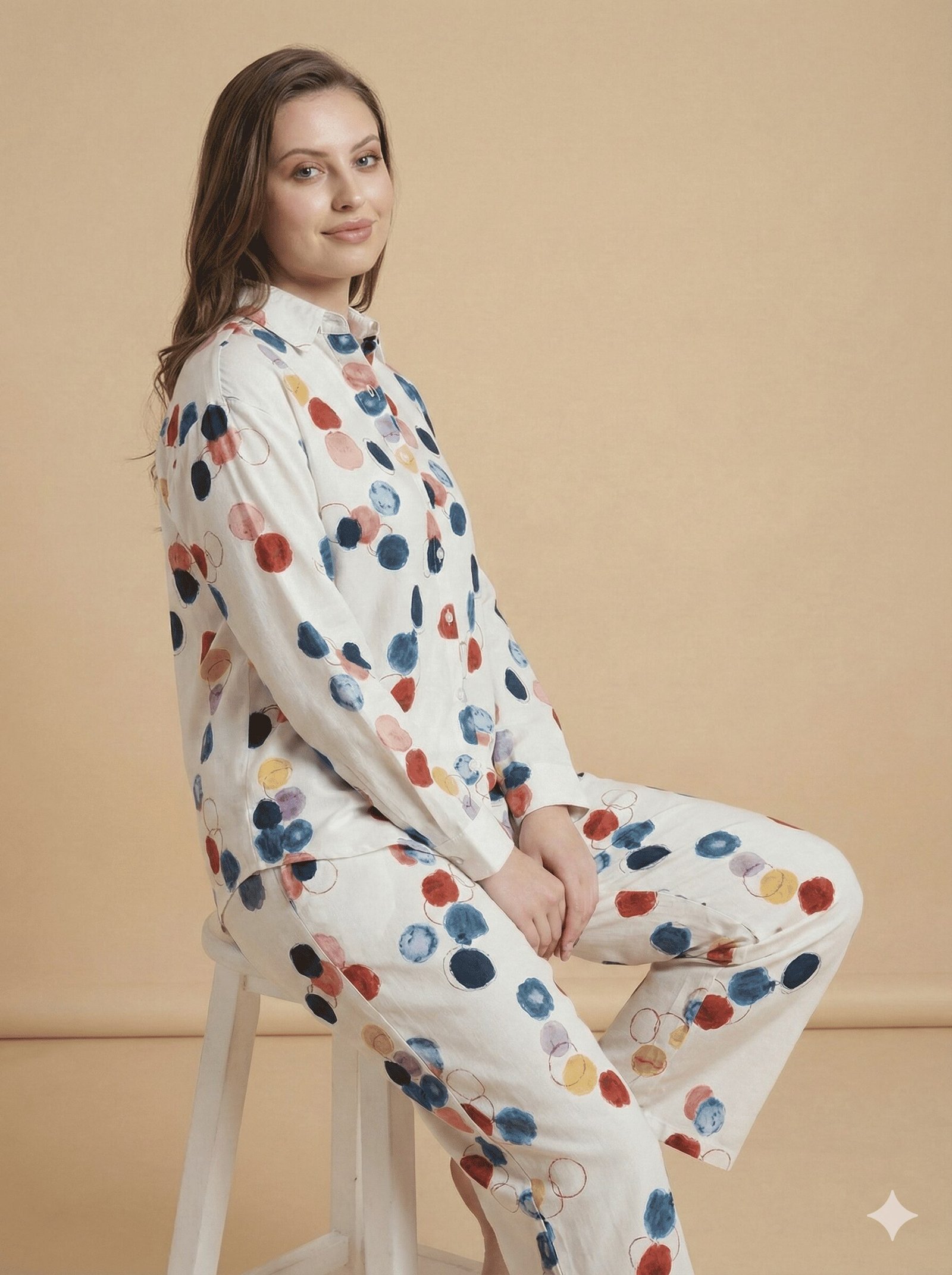 The top is a classic button-down shirt featuring a sharp collar and long sleeves, offering a polished look even when you’re just waking up. It is adorned with a vibrant, watercolor-style print of circles in shades of deep blue, rustic red, and golden yellow against a crisp white background. The matching trousers are designed for ease, featuring a comfortable straight-leg cut that allows for unrestricted movement.