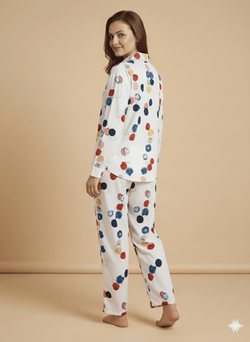 Elevate your sleepwear collection with this chic white pajama set featuring a playful, abstract circle print. The set includes a classic long-sleeve button-down shirt with a smart collar and matching relaxed-fit trousers, perfect for cozy mornings and restful nights.