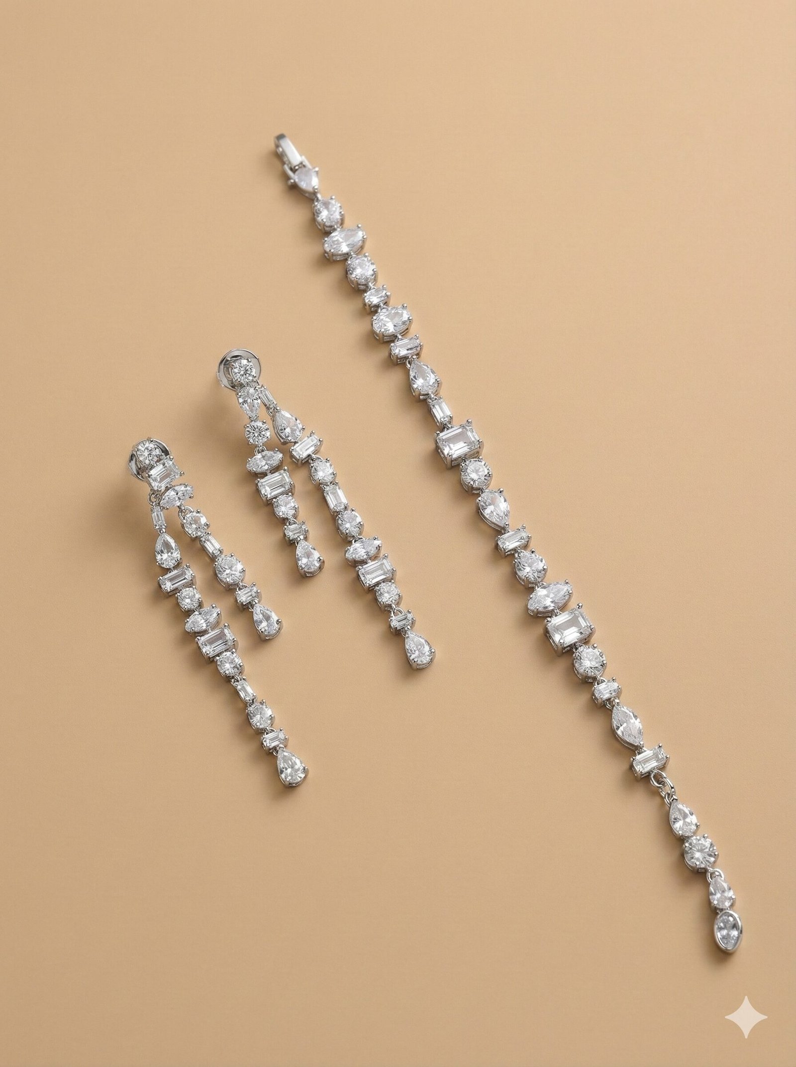 Style: This set showcases a dynamic arrangement of clear, faceted stones in emerald, oval, pear, and round cuts, all prong-set in a silver-tone finish. The design features a collar-style necklace with an adjustable chain extender, a flexible link bracelet, and statement earrings defined by two cascading strands of differing lengths.