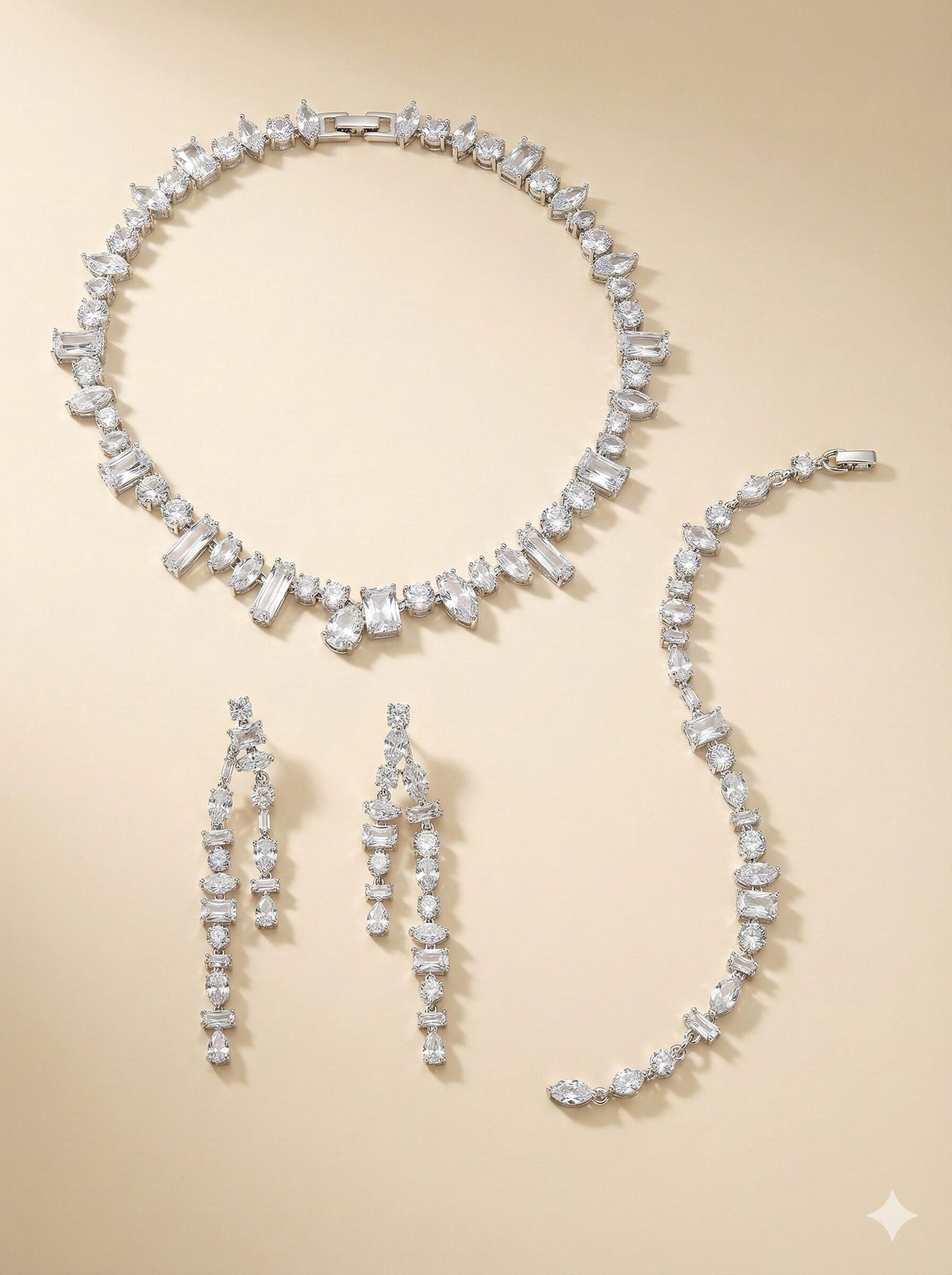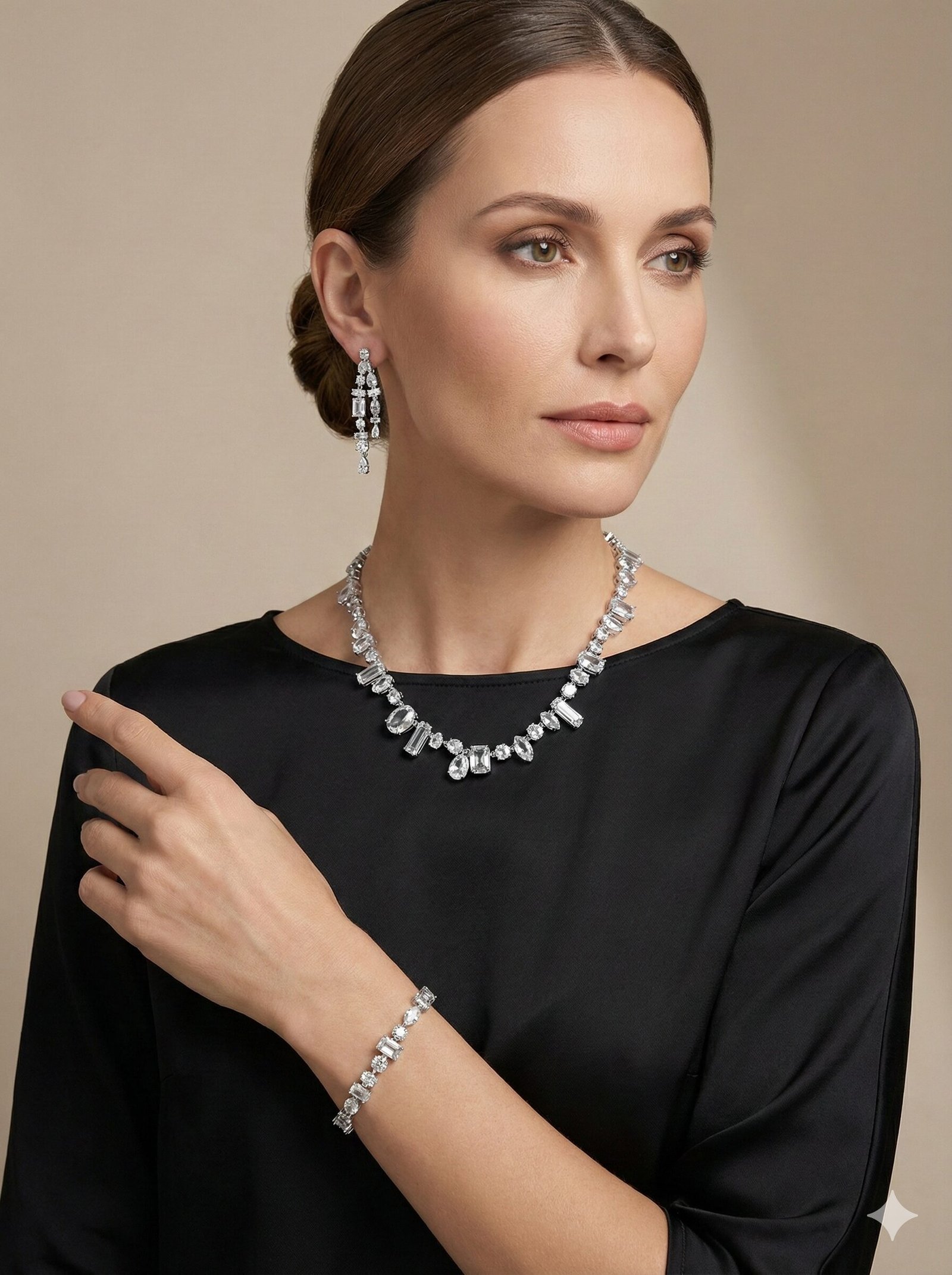 Elevate your formal attire with this sophisticated jewelry ensemble designed to capture and reflect light.