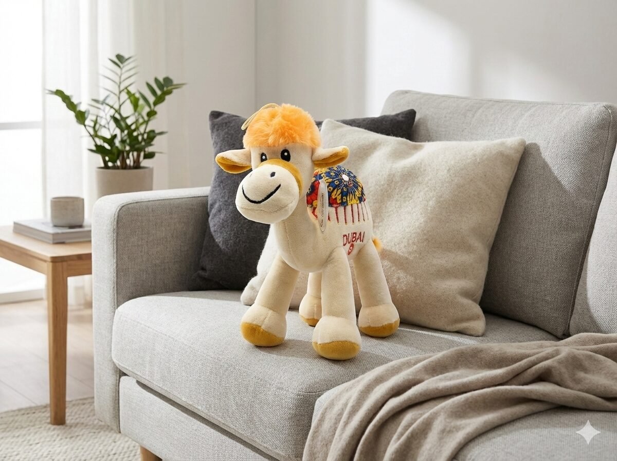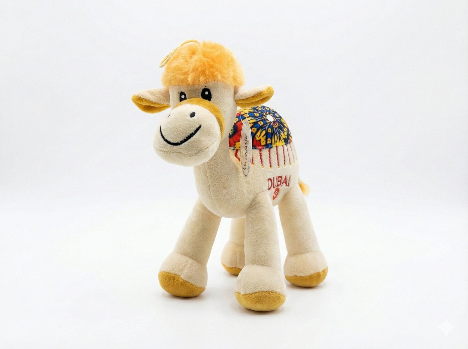 Intricate Mosaic Saddle: The highlight of this plush is its beautifully detailed saddle, featuring a colorful mosaic or mandala-style pattern in shades of blue, red, and yellow. The word “DUBAI” is prominently embroidered in red uppercase letters on the side.