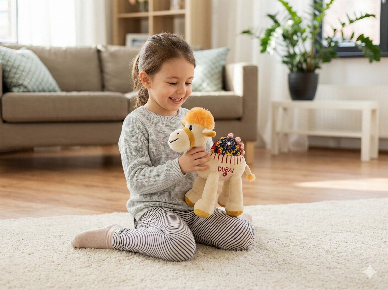 A Colorful Keepsake from the Emirates Add a splash of color to your home with the “Sunny” Dubai Edition plush camel. Distinct from the classic beige styles, this playful variant stands out with its bright orange and yellow accents and intricate saddle design, capturing the vibrant spirit of Dubai.