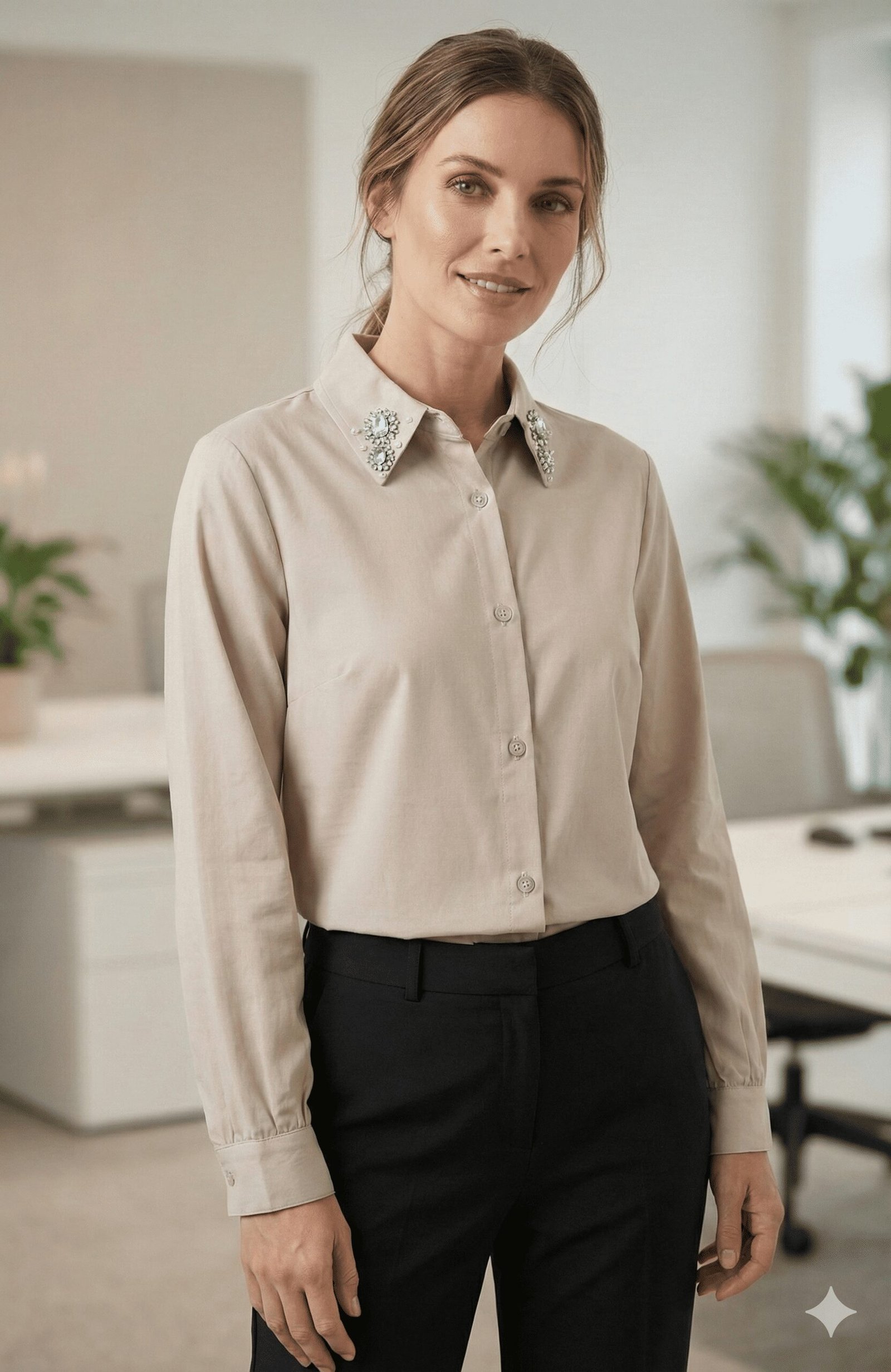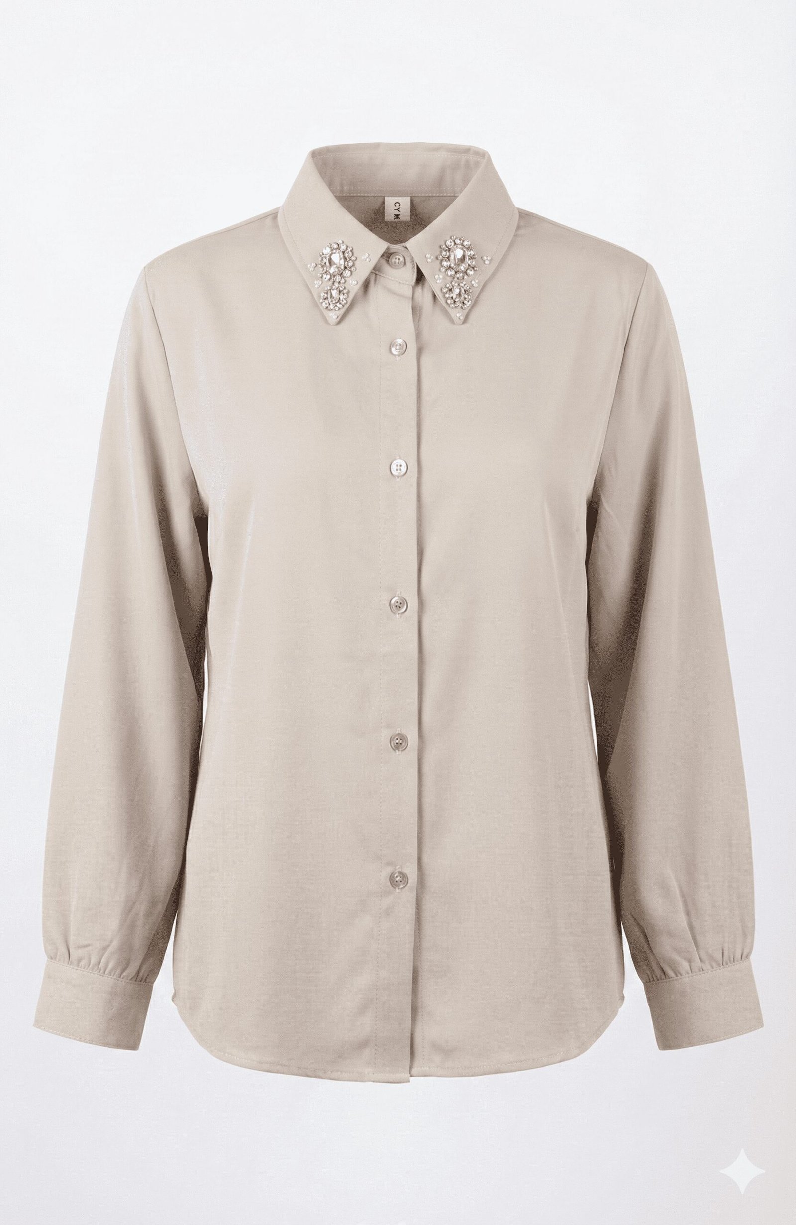 Transform your everyday wardrobe with this sophisticated embellished shirt, crafted in a versatile sand beige hue that complements any season.