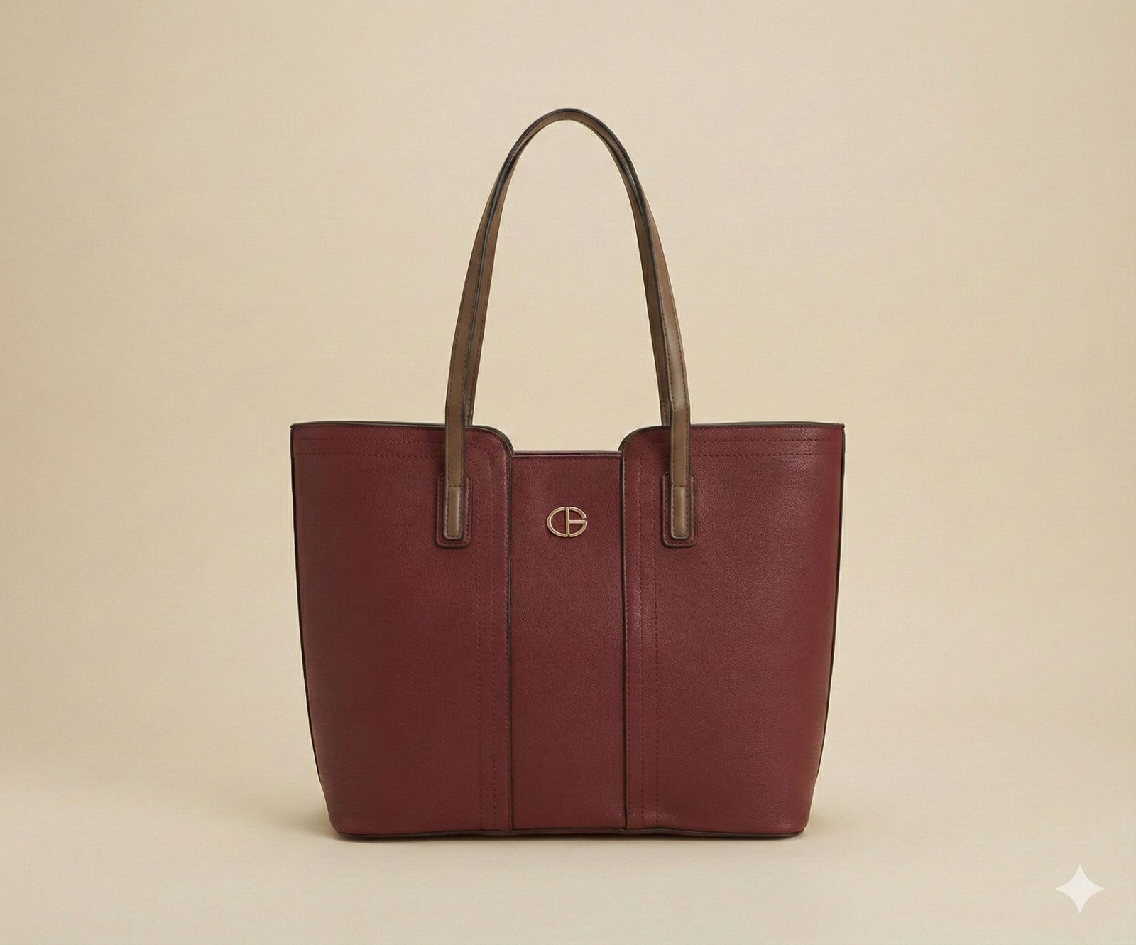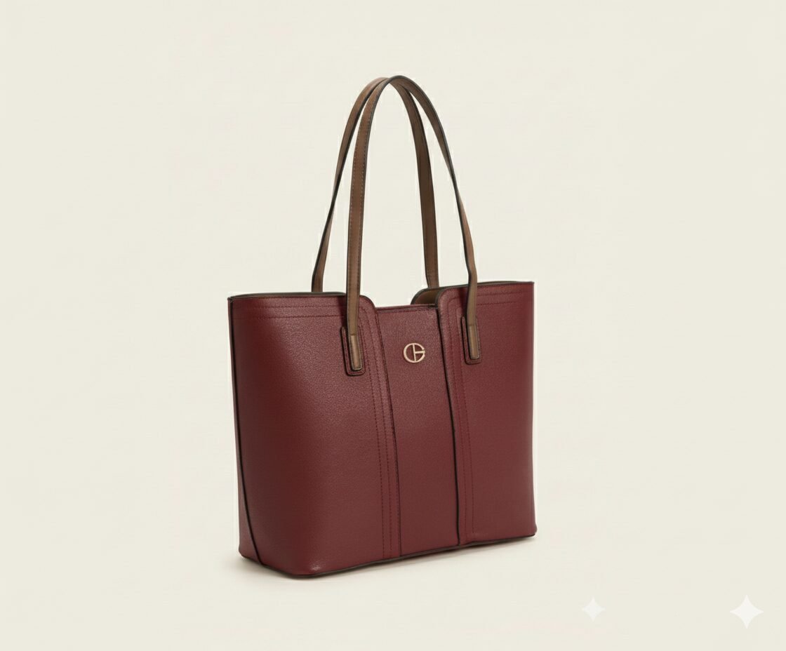 Elegant Two-Tone Design The bag boasts a smooth, deep wine-red exterior that exudes confidence and style. It is framed by flat shoulder straps in a contrasting taupe shade, creating a subtle yet modern color block effect. Vertical panel stitching and a central gold-tone logo emblem complete the refined look.