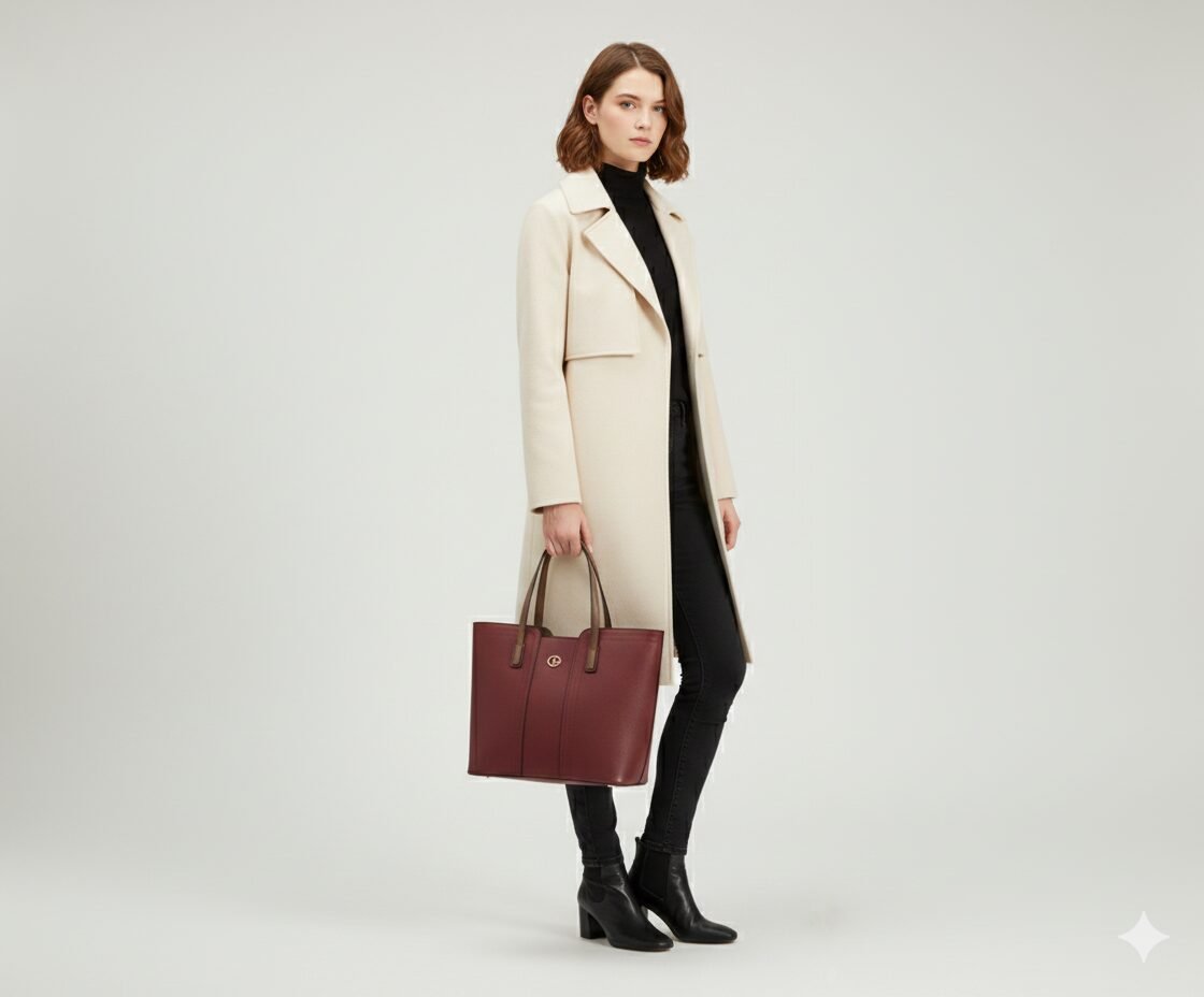 Versatile Styling This tote is the perfect statement piece to break up neutral winter layers. As seen on the model, the rich burgundy tone pairs exceptionally well with cream coats and black separates, adding a sophisticated pop of color to a classic ensemble.