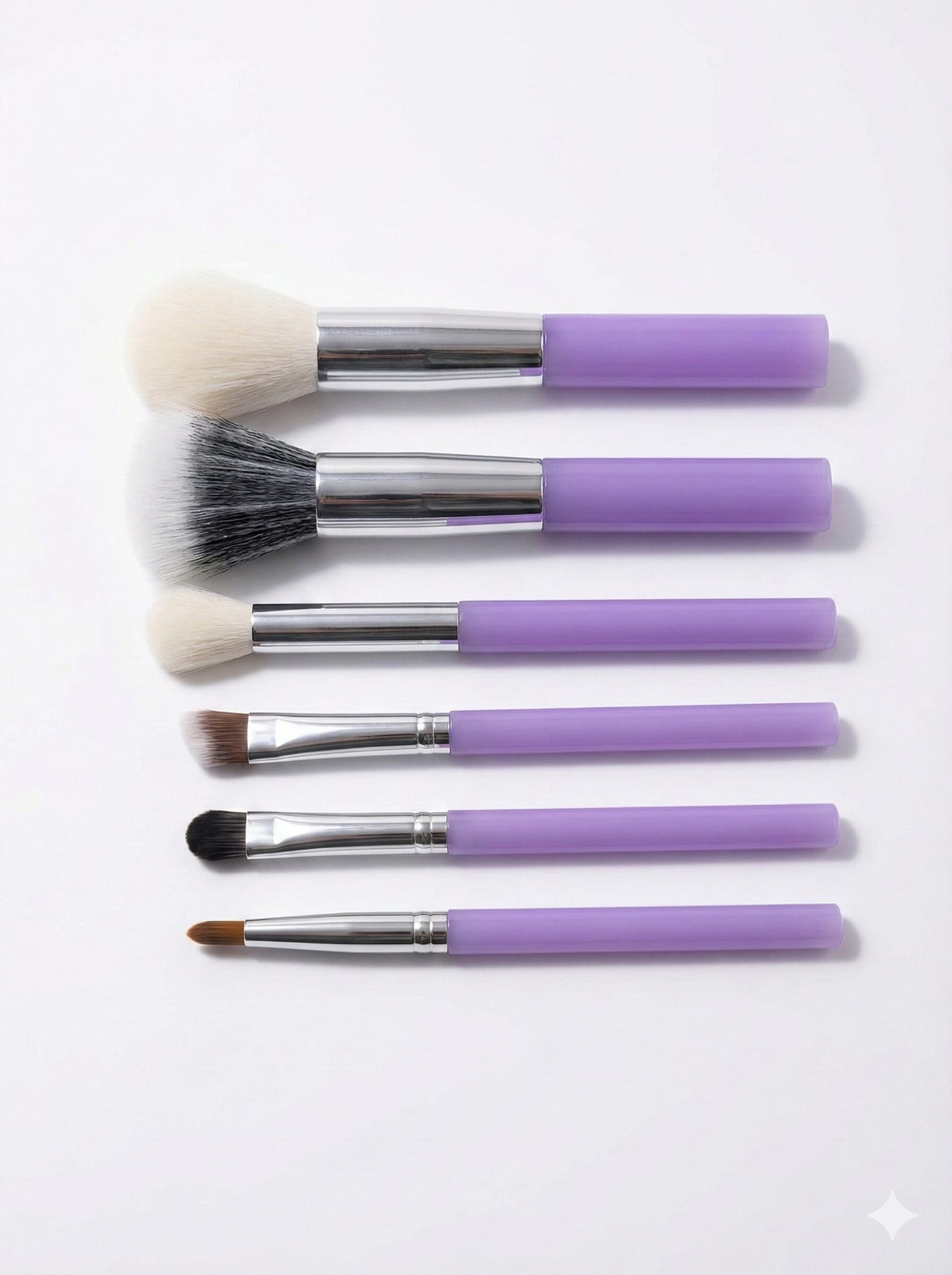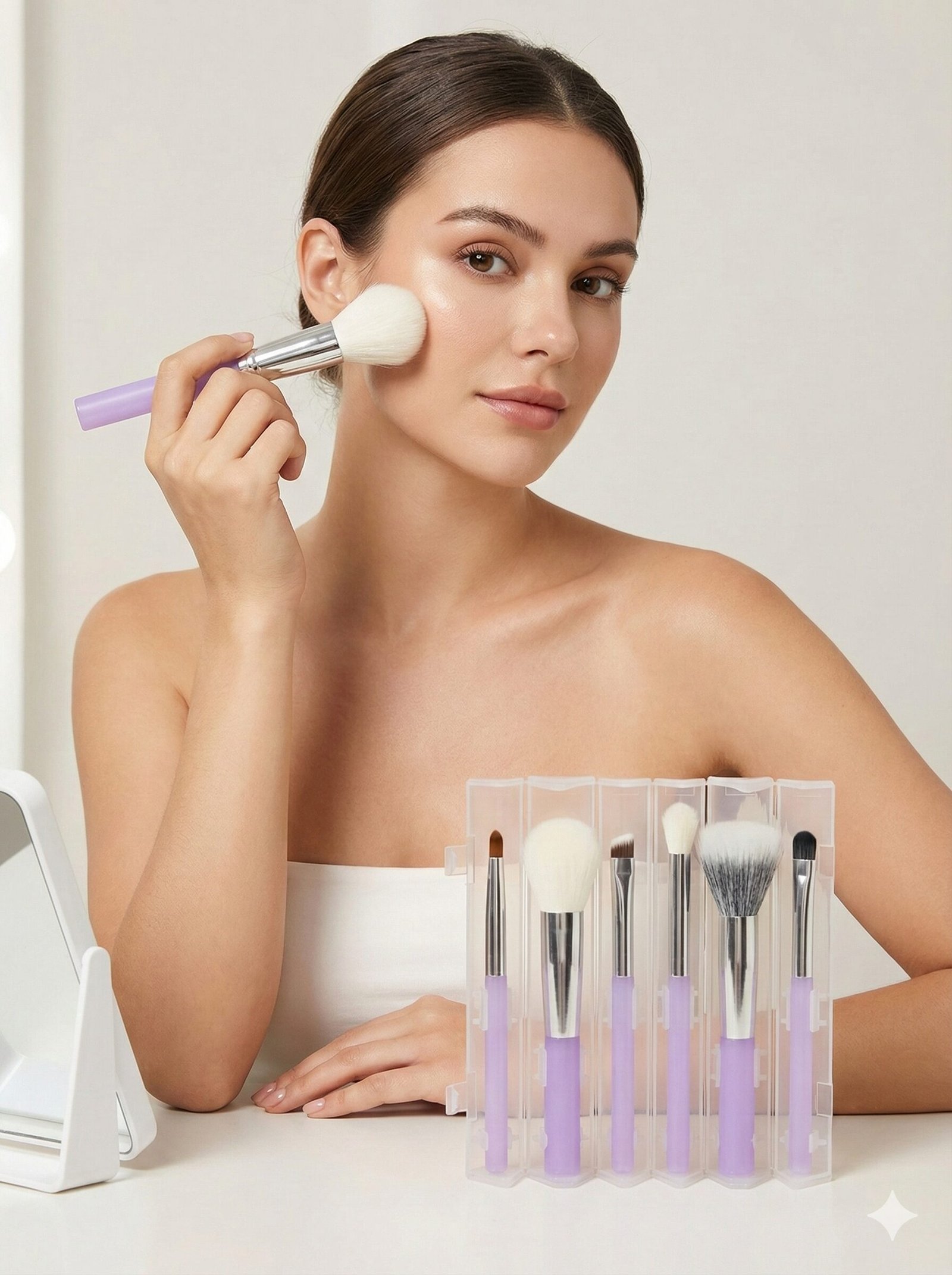 Meet your new travel essential: a comprehensive 6-piece brush collection designed for flawless application anywhere. This set includes a large powder brush, fan brush, and precision eye tools, all crafted with ultra-soft bristles and finished with stylish pastel purple handles. The standout feature is the durable, translucent geometric case that keeps your brushes hygienic and bristles safe from damage inside your bag. When you are ready to get glam, the case snaps back to form a sturdy vanity stand, keeping your tools organized and upright. Compact, stylish, and functional, this set ensures you never have to compromise your look while on the move.