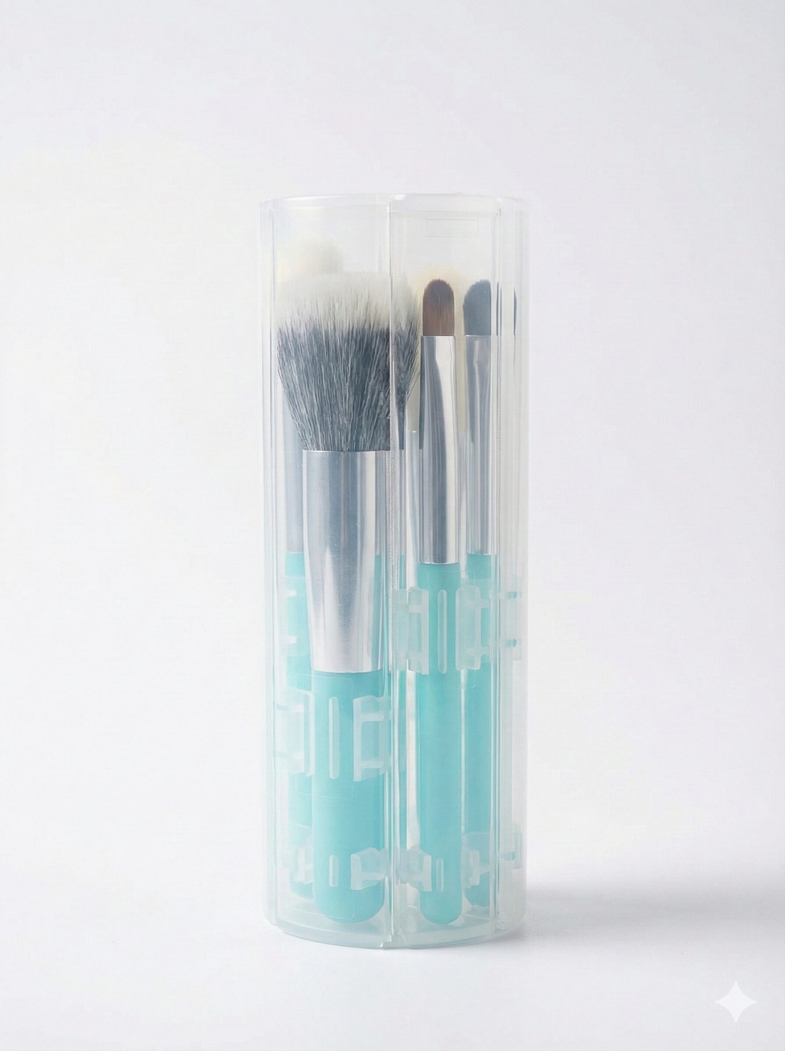 Meet your new travel essential: a comprehensive 6-piece brush collection designed for flawless application anywhere. This set includes a powder brush, fan brush, and precision eye tools, all crafted with ultra-soft, cruelty-free synthetic bristles that handle both liquids and powders with ease. The standout feature is the durable, translucent geometric case that keeps your brushes hygienic and bristles safe from damage inside your bag. When you are ready to get glam, the case snaps back to form a sturdy vanity stand, keeping your tools organized and upright. Compact, stylish, and functional, this set ensures you never have to compromise your look while on the move.