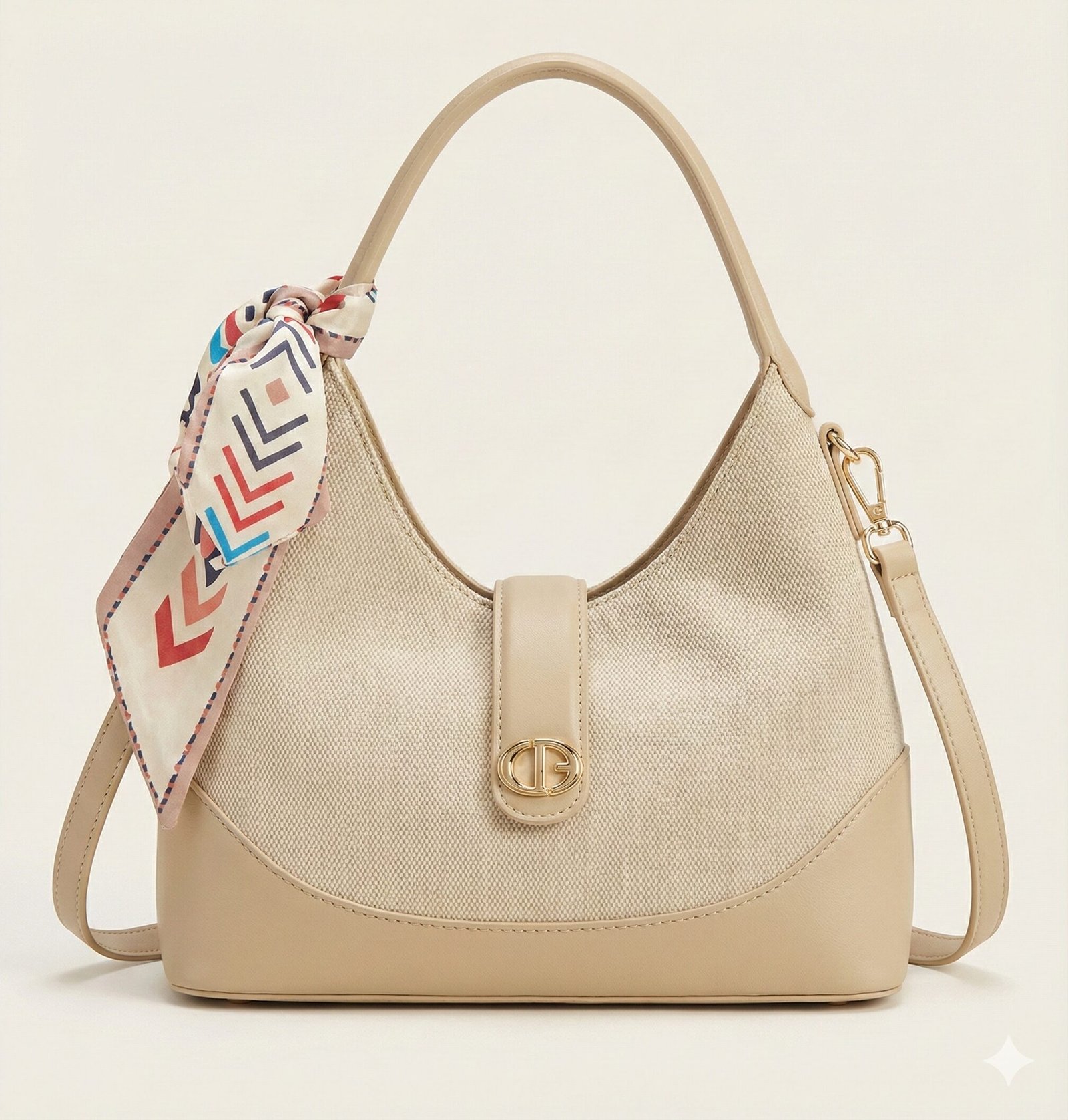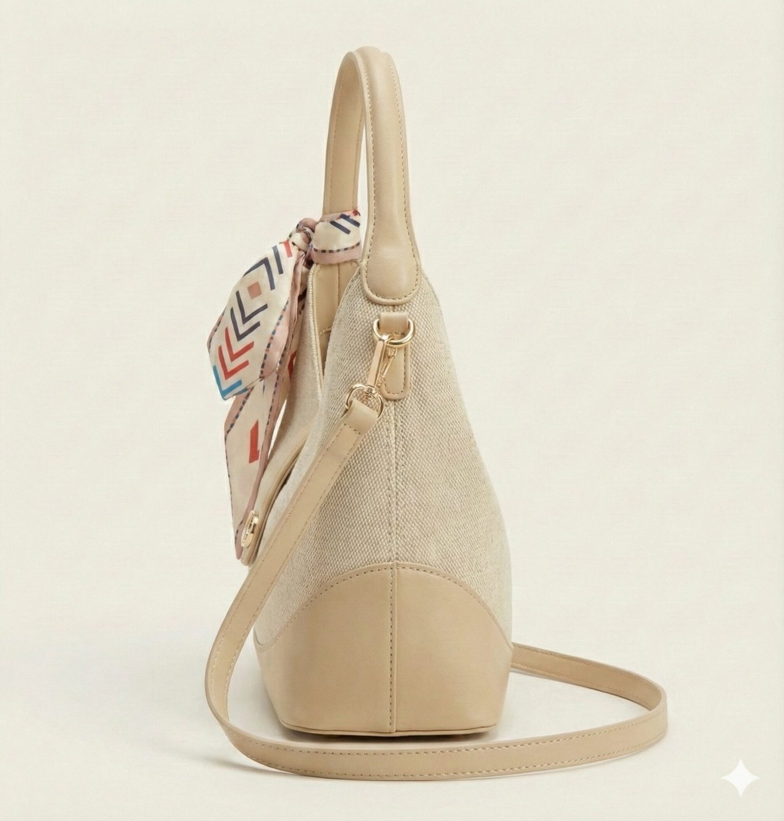Playful Accent A removable silky scarf is tied to the handle, featuring a vibrant chevron arrow pattern in red, blue, and beige. This accessory adds a lively contrast to the bag’s understated main colors.