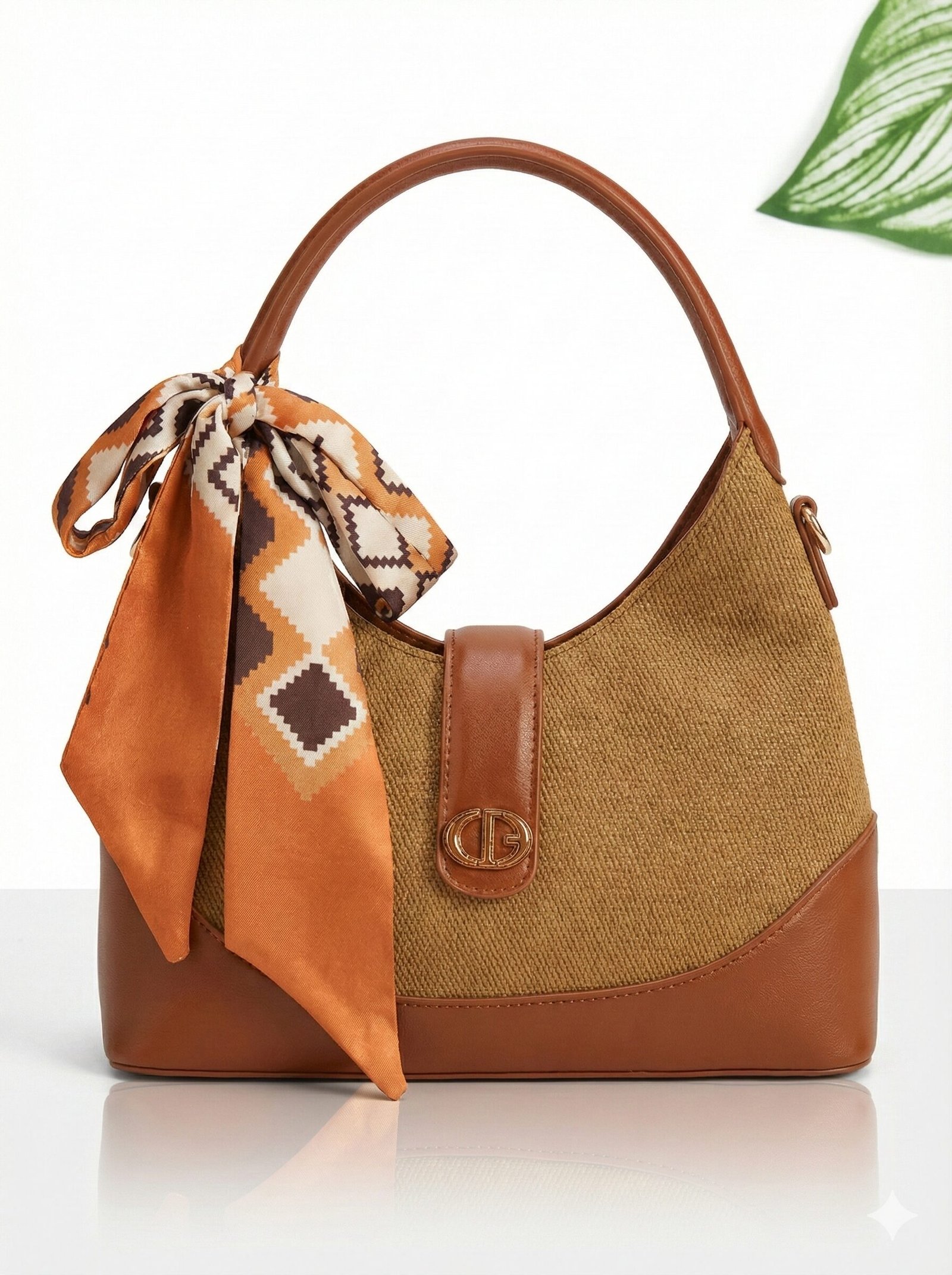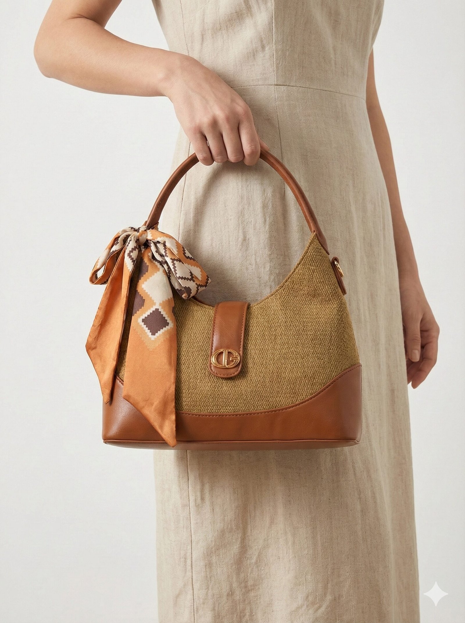 Statement Accessory A removable silky scarf is tied to the handle, featuring a geometric print in shades of burnt orange, brown, and cream. This accessory adds a playful movement and a pop of color that perfectly complements the bag’s earth tones.