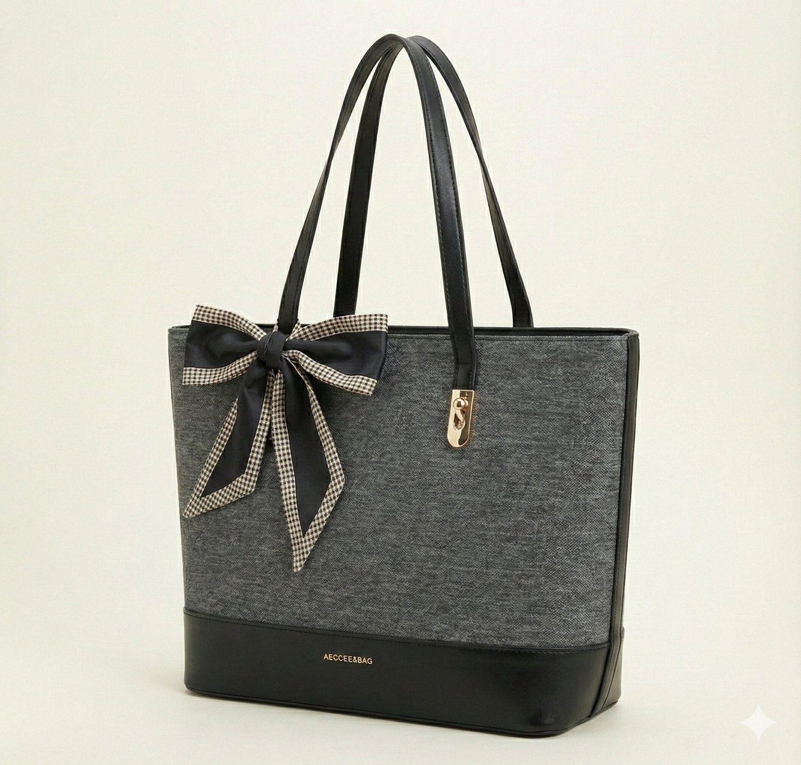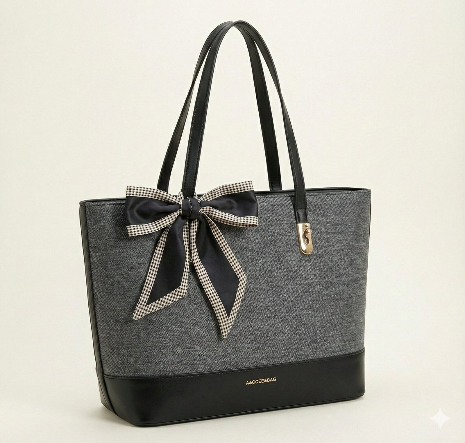 Chic Details A statement bow scarf is tied to the handle, featuring a black center with a classic gingham check border. This accessory adds a playful yet polished element to the structured silhouette. Gold-tone hardware and a minimalist logo stamp at the base complete the premium design.