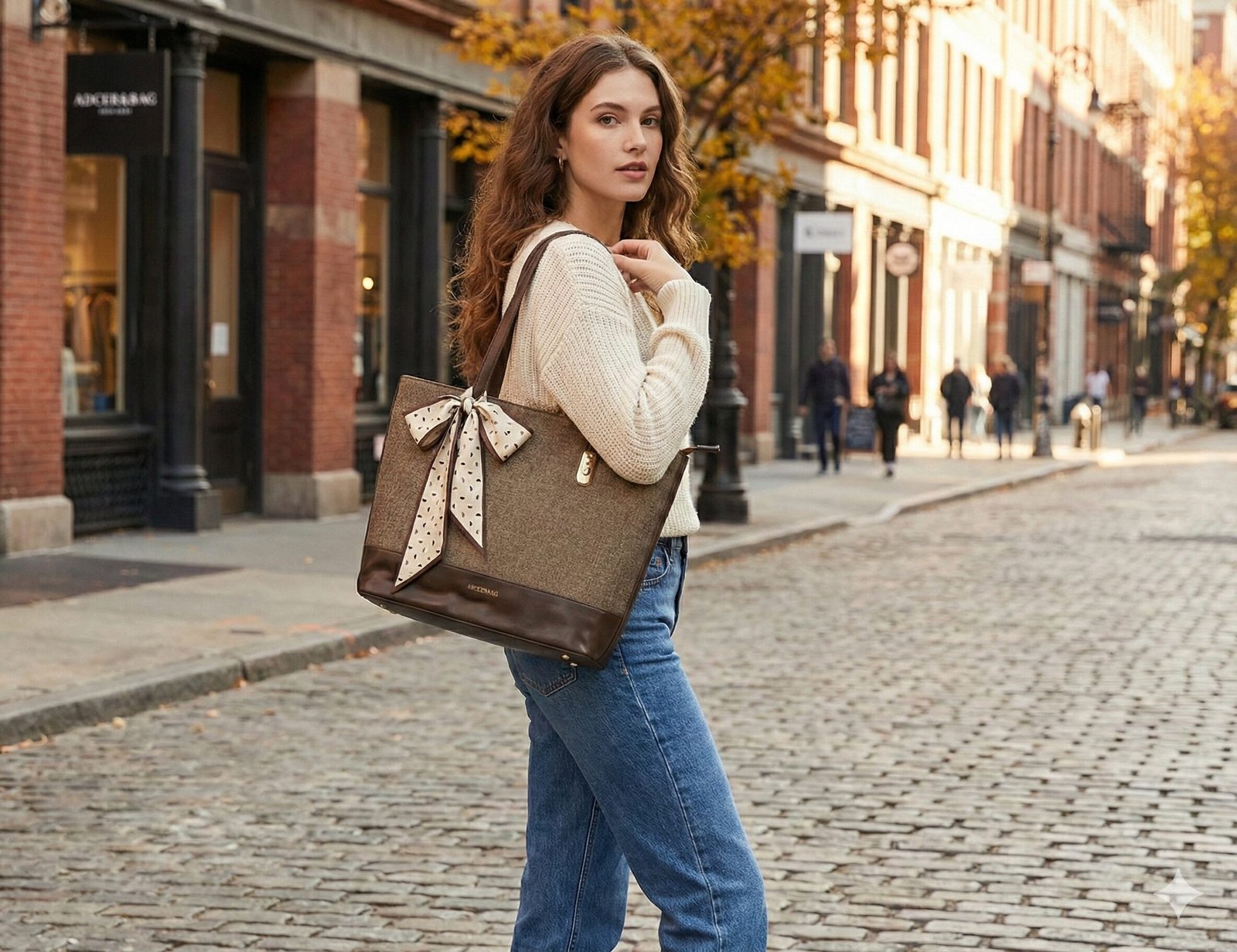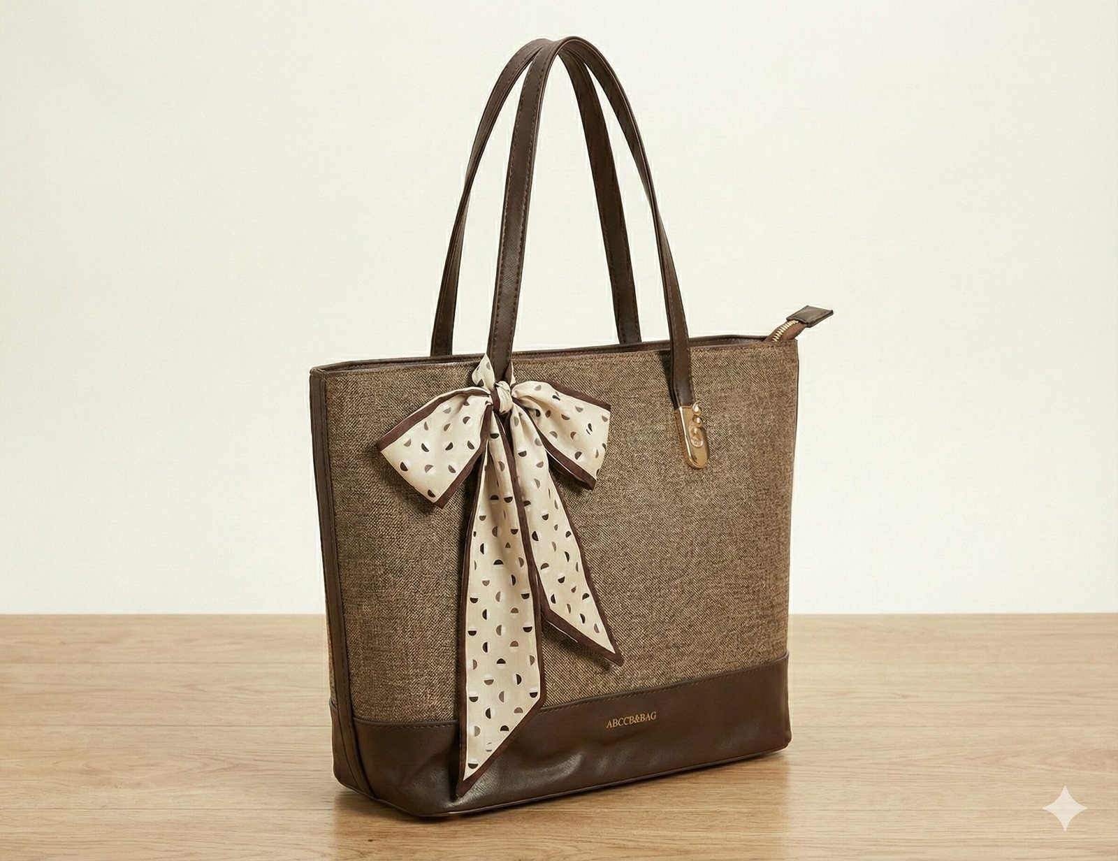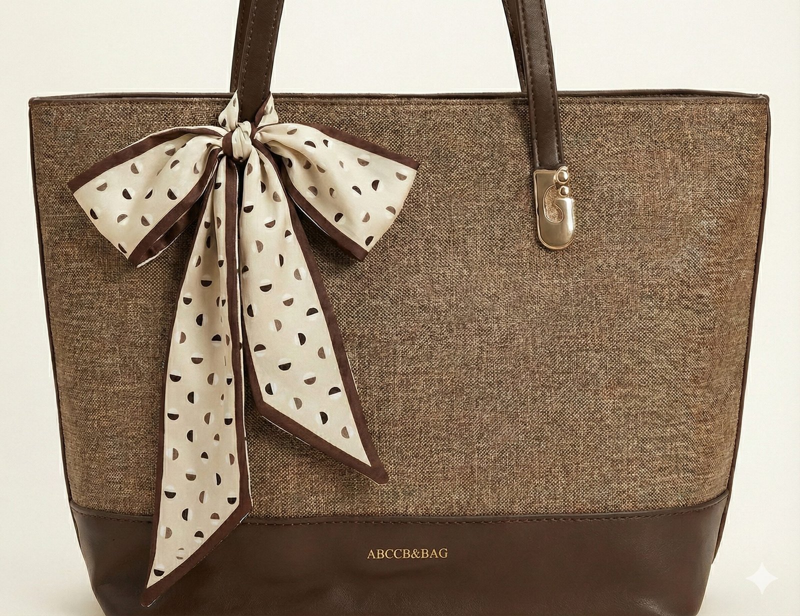 Feminine Accent A statement bow scarf is tied to the handle, featuring a cream background with a playful brown geometric semi-circle pattern. This accessory softens the structured silhouette and adds a touch of personality.