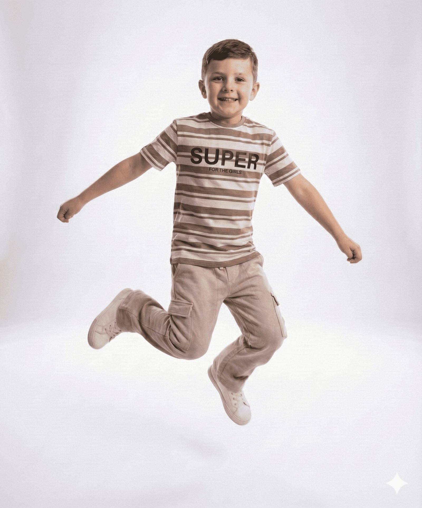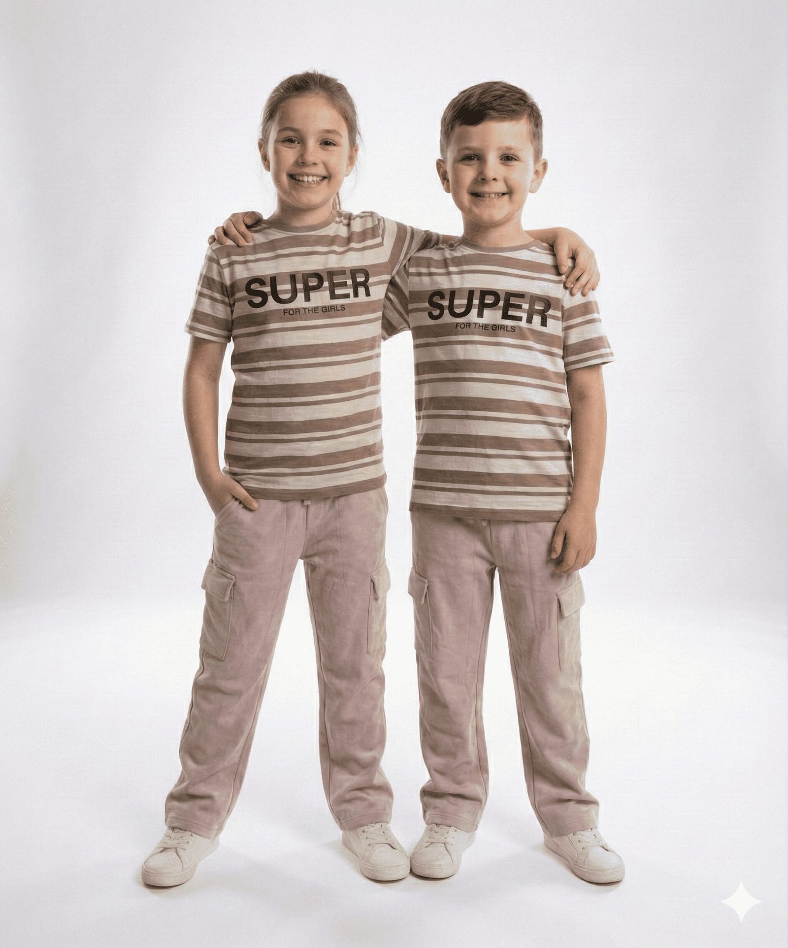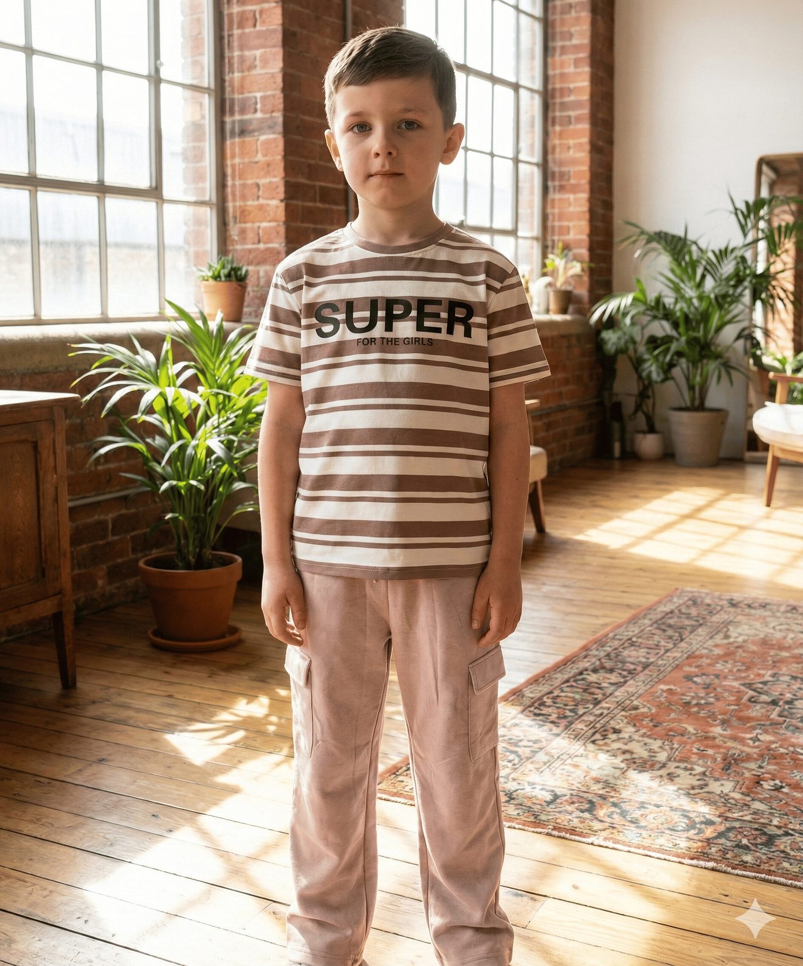 The top is a soft crewneck t-shirt featuring timeless horizontal stripes in mocha and cream, centered with a bold “SUPER” typographic print that makes a confident statement. Paired with it are stylish, solid-colored cargo pants designed for utility and comfort. These trousers feature practical side flap pockets—perfect for storing little treasures—and a relaxed straight-leg fit that allows for jumping, running, and climbing with ease.