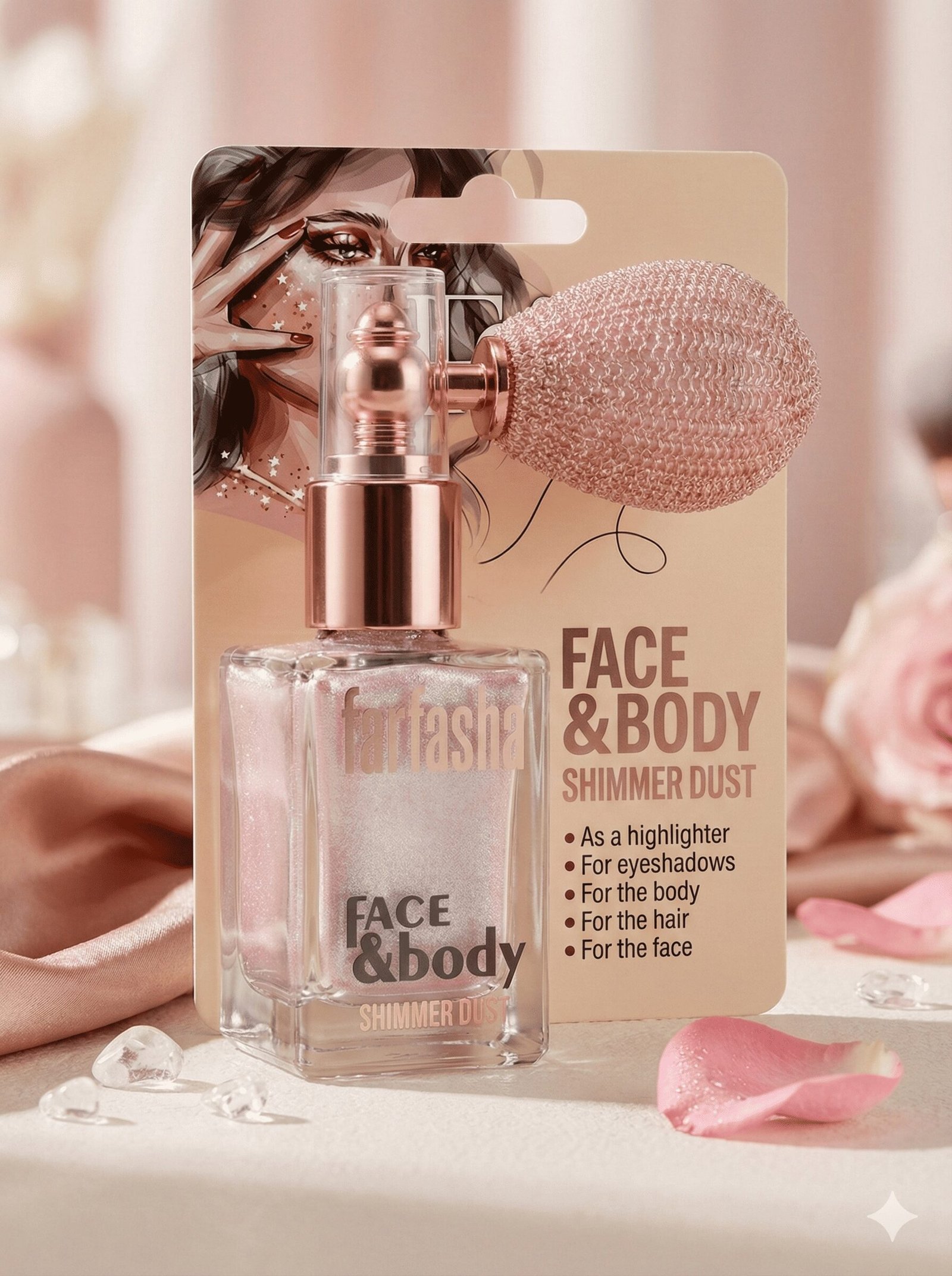 Multi-Purpose Formula: Designed for versatile use across the entire body. The packaging explicitly recommends it “As a highlighter,” “For eyeshadows,” “For the body,” “For the hair,” and “For the face.”