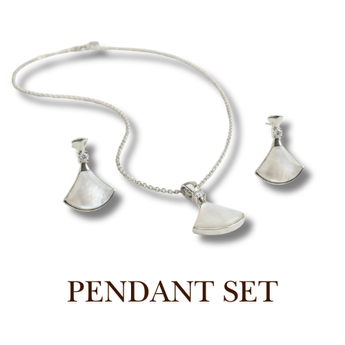 Silver-Tone Fan Pendant Necklace and Earrings Jewelry Set with White Pearlescent Inlay and Crystal Accents
